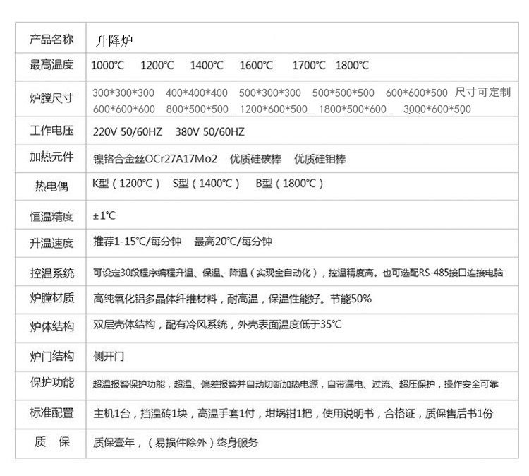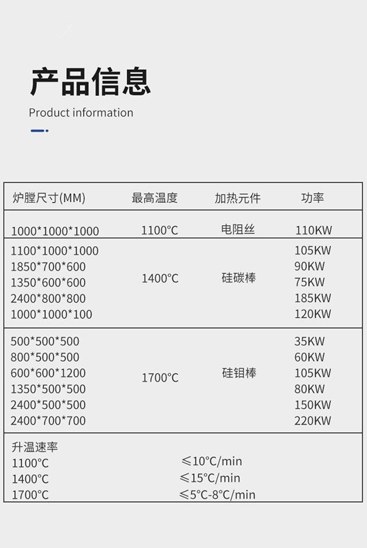 发热元件 | 电阻丝、硅碳棒、硅钼棒 | ||