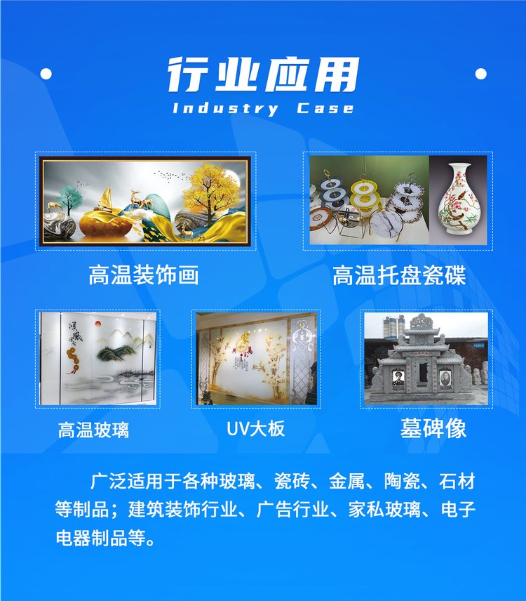 应用领域 | 玻璃印刷、钢化玻璃打印、瓷像打印、墓碑瓷像印刷、瓷砖画打印 | ||
