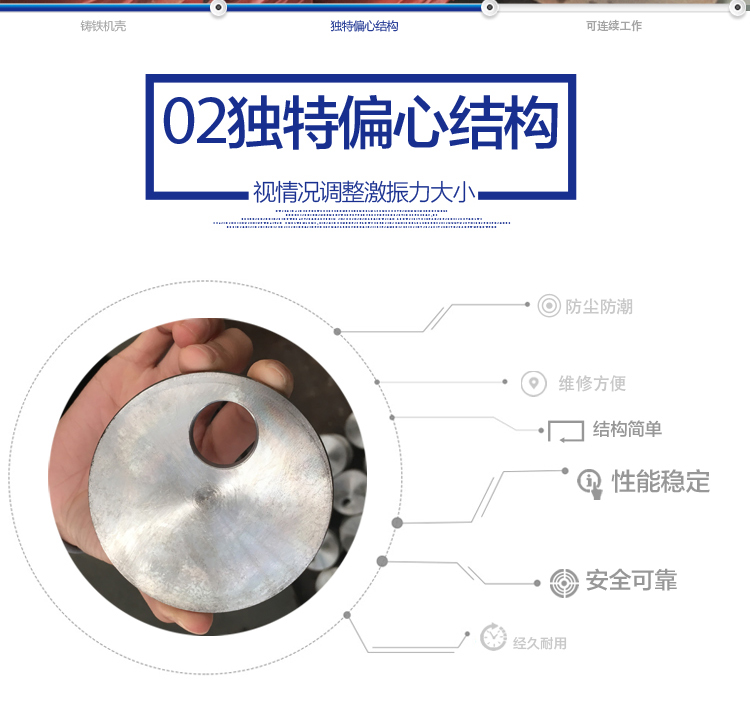 在振动电机轴两端各装一块或两块偏心快,当电机转动时偏心快随之绕中心轴作转动,产生离心力,从而形成振动。