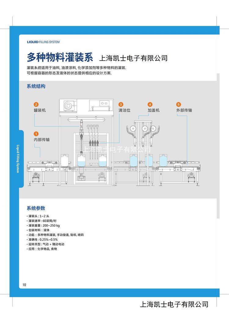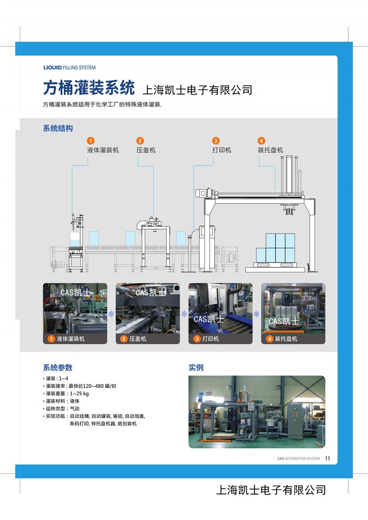 吸收韩国凯士CAS集团总部的技术优势,成功开发出5l、18l、20l、200l、吨桶全自动灌装线,5-50kg全自动称重包装码垛生产线等,灌装工位包括自动送桶、自动开盖、自动寻口、自动灌装、自动理盖上盖旋盖、自动装箱、自动封箱、自动码垛等,根据用户需求配置,经中石油、中石化、杜索、外高桥石化、亨斯迈、双汇集团等世界500强企业、国民品牌公司使用验证。