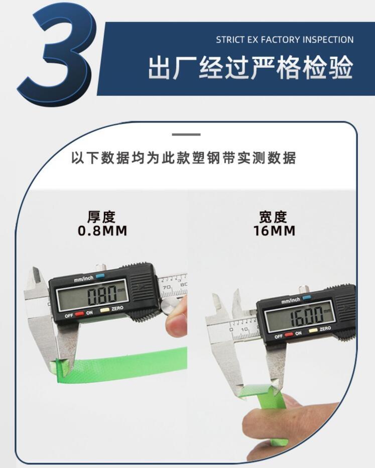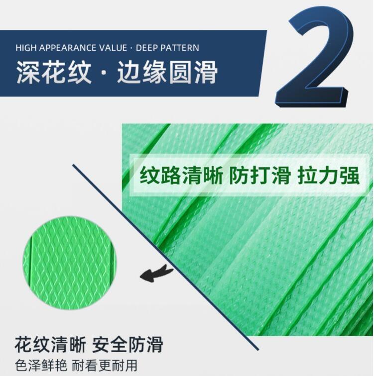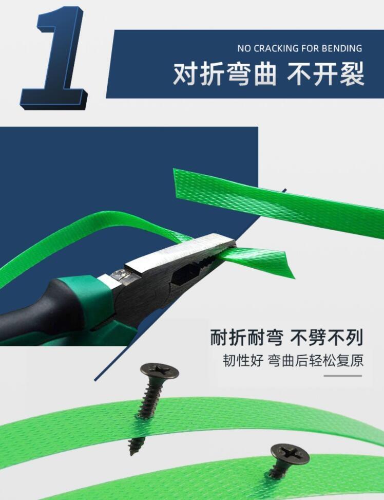 3、 绿色环保PET塑钢带采用食品级包装材料制造而成,具有防潮、防生锈、防水、抗腐蚀特征,不会污染包装物,符合环保的要求。