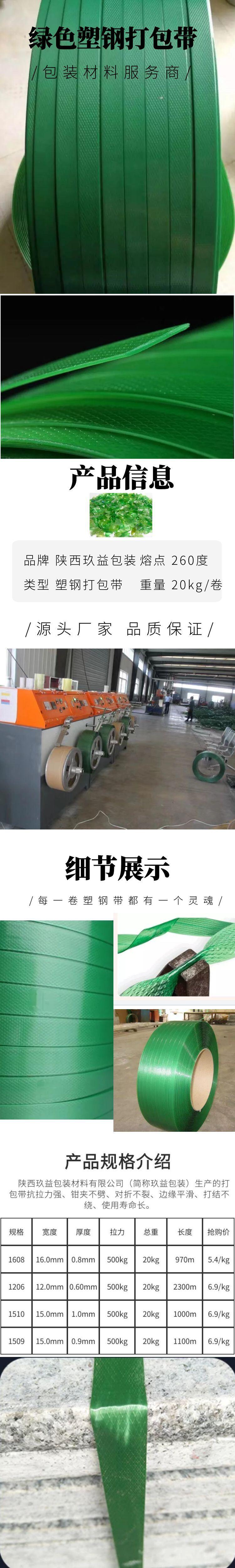 今天来看看1509机用塑钢打包带,其中1509全自动打包带是指宽度为15mm,厚度为0.9毫米的塑钢打包带,颜色为绿色,分为半透明和不透明的,一般重量分为20kg和40kg的,内有加固纸芯外侧缠绕膜包过,没有多余纸芯和纸质,我们精益求精,不会在包装上缩水!1509全自动打包带其拉力约为450kg,长度为1000米,颜色均匀上面印有防滑印花。