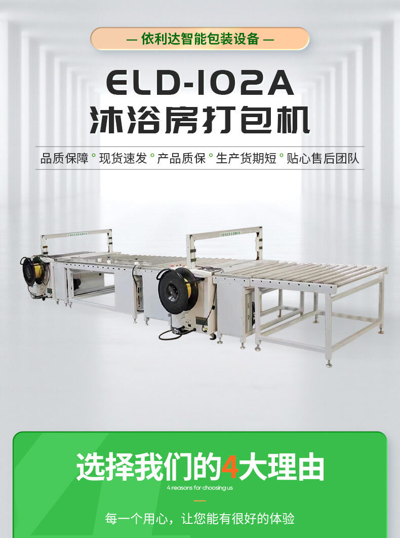 依利达ELD-102A淋浴房全自动打包机/中山佛山卫浴加宽型全自动打包机设备/广州木门塑料门全自动无人化捆扎机/三水高明陶瓷洁具自动化捆包机/顺德江门户外家具外包装纸箱在线式打包机/东莞深圳惠州金属五金制品流水线式全自动井字形打包机:主要适应于体积大件的物品打包装,先平行打1~3道(根据客户需求设定),90°转向,到下一个动作,平行打1~6道(根据客户需求设定),完成井字形全自动无人化打包。
