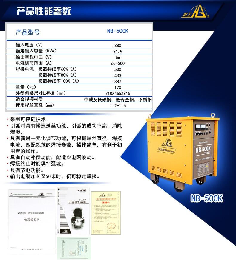 NB-350K/NB-500K可控硅式气保焊能焊接直径0.8-1.2mm/1.2-1.6mm的实芯、药芯焊丝。