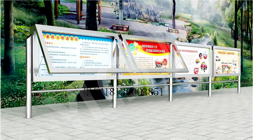 为了遮挡阳光和雨水,公告栏一般会有顶棚。公告栏有前开门和后开门之分,前开门用玻璃锁,后开门用普通锁具就可以,内容多是写真画面或纸张内容。个人认为公告栏采用后开门会更好一些,后开门的公告栏防水防尘比前开门要好。