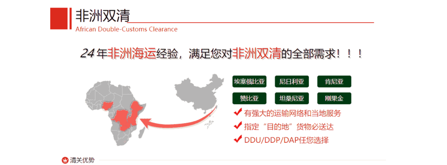 非洲双清专线主要提供从中国到非洲各国的海运、空运和陆运服务。该业务范围包括进出口货物的报关、清关、运输、仓储等一站式服务,旨在为客户提供安全、快捷、可靠的物流体验。
