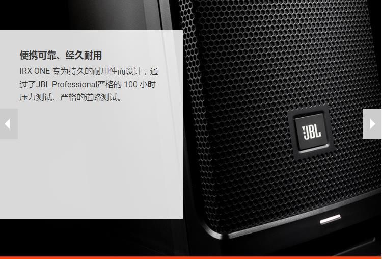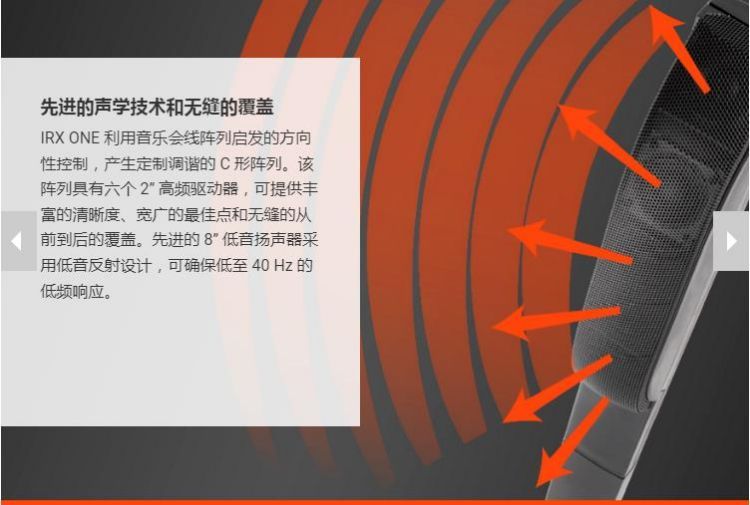 IRX ONE 拥有传奇的 JBL Professional 保真度和性能,利用音乐会线阵列启发的指向性控制,从而产生定制调谐的 C 形阵列。该阵列具有六个 2” 高频驱动器,可提供更高的清晰度、宽广的点和无缝的从前到后的覆盖。 先进的 8”低音扬声器采用低音反射设计,可确保低至 40 Hz 的低频响应。
