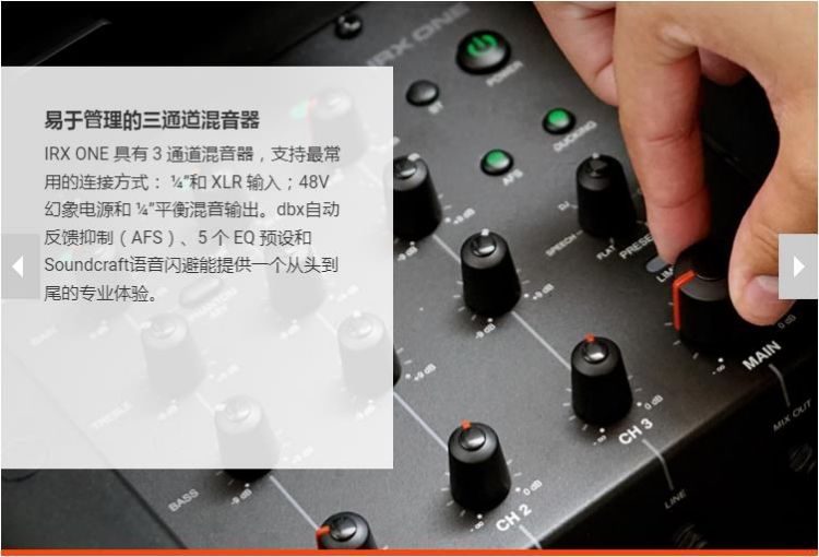 IRX ONE旨在支持一系列不同的用户,它具有一个3通道混音器,支持最常见的连接,包括?”和XLR输入,以及48V幻象供电和?”母线输出。dbx自动反馈抑制(AFS)、5个EQ预设、Soundcraft音频回避和蓝牙5.0音频流可确保自始至终的体验。