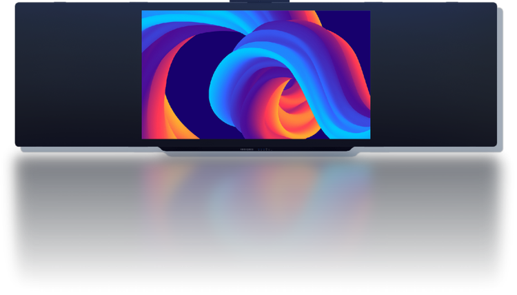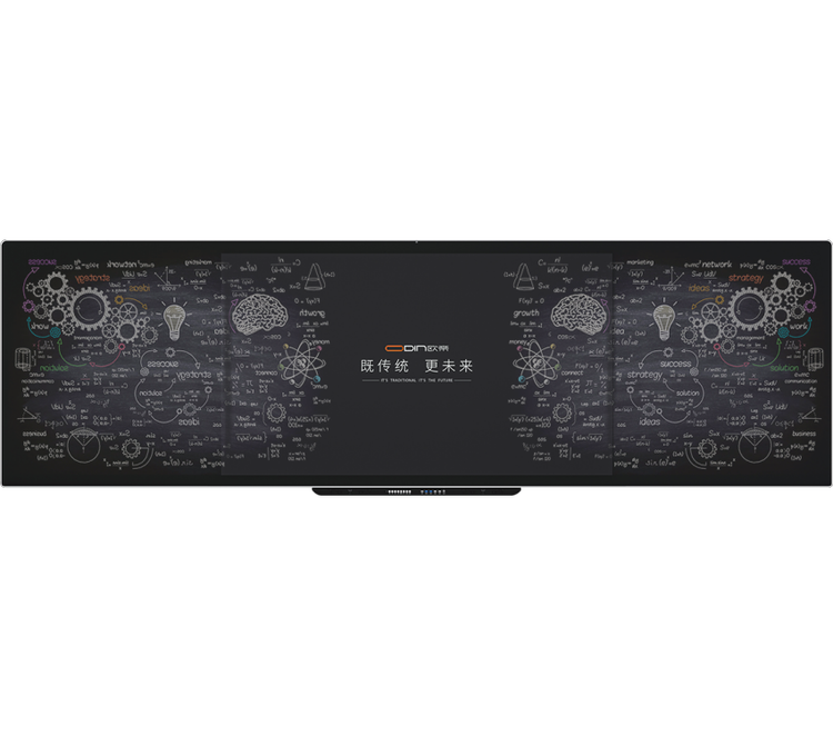 正面显示为一个由三块拼接而成的平面普通黑板,可以在上面用各种水笔书写,又可以根据需要采用无尘粉笔书写。产品支持手势识别功能,手势触控后,中间一块显示出液晶的显示画面,可以进行触摸互动,再次手势触控识别时,显示画面隐形,又显示为一个普通黑板的表象,可以在上面进行书写。