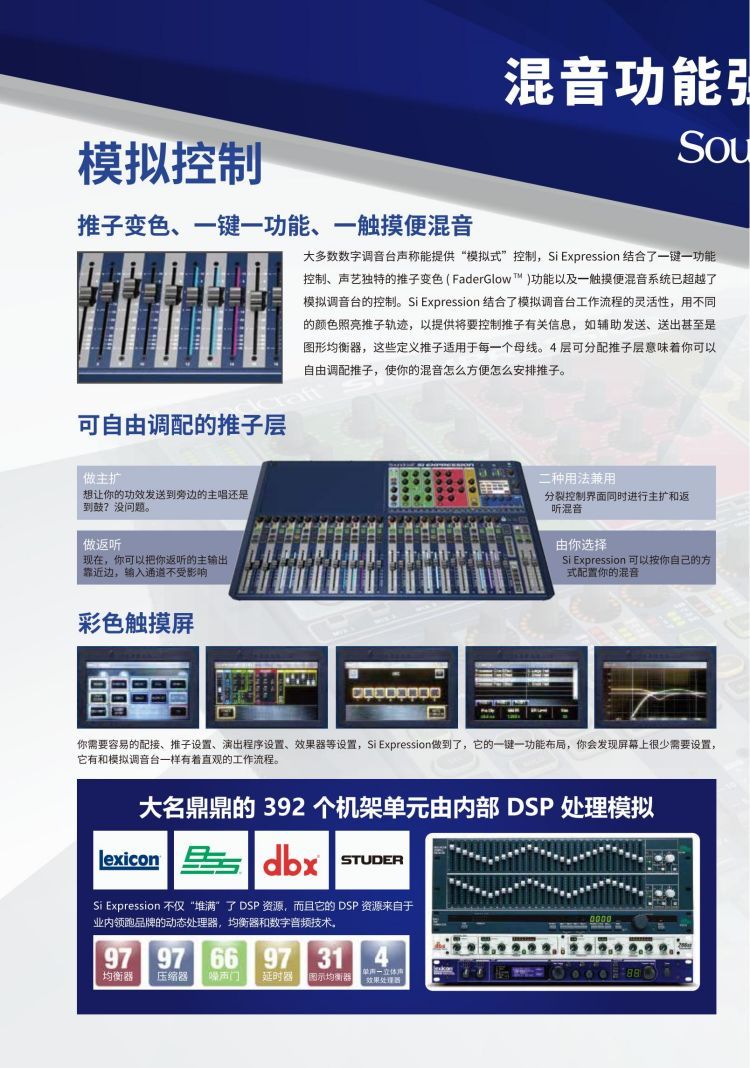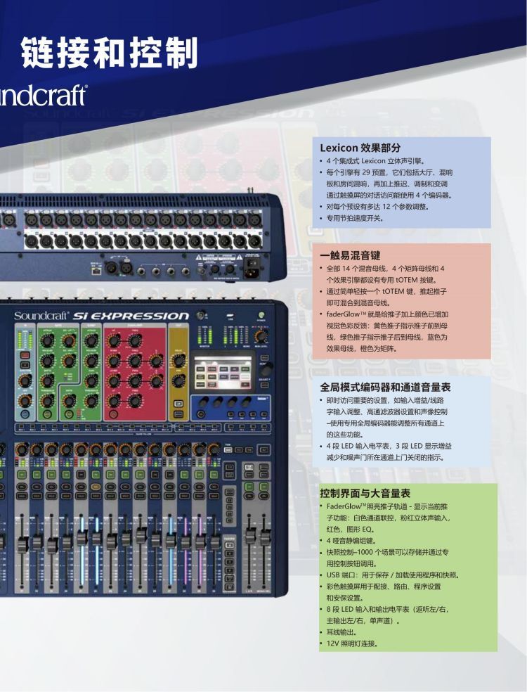 具有Soundcraft FaderGlow?功能,每个推子插槽对应的功能,包括 FX,立体声,连接单声道,GEQ,推子后辅助,推子前辅助均配有各种颜色的指示灯