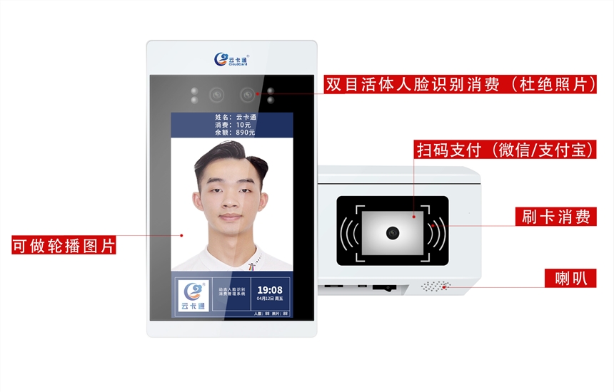 动态人脸识别消费机是采用红外高清双目摄像头、先进的人脸检测识别算法,通过摄像头采集的画面传递给算法处理,算法对图片数据进行识别判断,先检测到人脸,然后提取人脸特征,最后将特征进行比对,返回识别结果,自带活体检测功能,有效杜绝照片和视频消费。取代磁卡,接触式IC卡等传统消费机,是广大学校,企事业单位提高管理水平,实现智能化的最佳选择。
