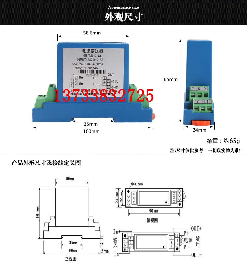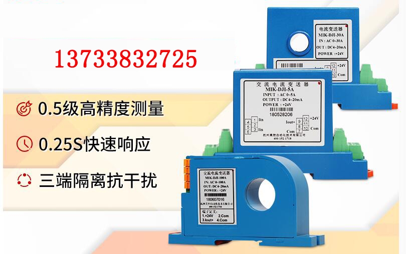 直流电流变送器是一种利用光电隔离原理将被测直流电压转换成与原边电流成比例输出的直流电流或直流电压信号的测量模块,原副边之间高度绝缘,具有高精确度、高线性度、高集成度、体积小结构简单、长期工作稳定且适应各种工作环境的特点.广泛地应用在电力、石油、煤矿、化工、铁路、通信、楼宇自控等行业的电气设备的系统控制及检测.,用于测量交流电压,过载能力强高,DIN导轨安装,原副边 高度绝缘。 二、产品基本功能和技术参数 01、输入电流:0-0.01A,0-0.0A,0-1A,0-1.5A,0-2A,自定义(可根据用户要求定做量程) 02、输出信号:标准电压DC0-5V,DC0-10V,标准电流DC4-20mA,DC0-20mA 03、精度:0.5 04、线性度误差:0.2 05、供电电源:DC24V 06、反应时间:小于10ms 07、耗电:20mA,(电流输出型+IS) 08、负载电阻:大于5000欧(电压输出型),小于450欧(电流输出型) 09、工作温度:-10-70 10、储存温度:-55-85 11、重量:约0.2Kg 12、工作湿度:20-85