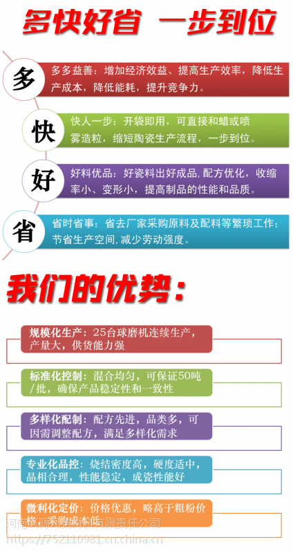 1.使用方便:缩短陶瓷生产流程,开包即用;热压铸工艺可以直接和蜡使用;干压、等静压工艺可以直接造粒使用。