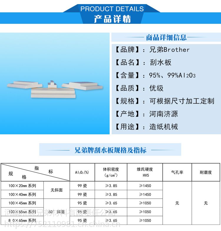 兄弟牌99氧化铝陶瓷刮水板具有强度高、硬度高、耐磨性好、摩擦系数小等特点,品质远高于国内同行业产品,上市不久就受到业界的认可和使用厂家的信赖,将逐步替代进口陶瓷。产品现有规格20、30、40、45、65、200等,还可根据客户要求加工不同规格的产品。