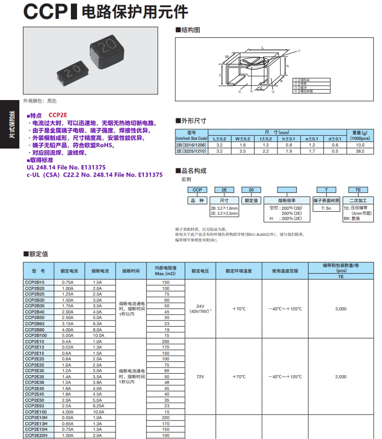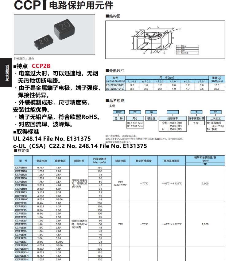 ■特点 ?电流过大时,可以迅速地,无烟无热地切断电路。 ?由于是金属端子电极,端子强度、焊接性优异。 ?外装模制成形,尺寸精度高,安装性能优异。 ?端子无铅产品,符合欧盟RoHS。 ?对应回流焊、波峰焊。 ■取得标准 UL 248.14 File No. E131375 c-UL(CSA)C22.2 No. 248.14 File No. E131375