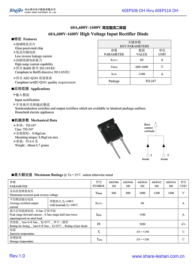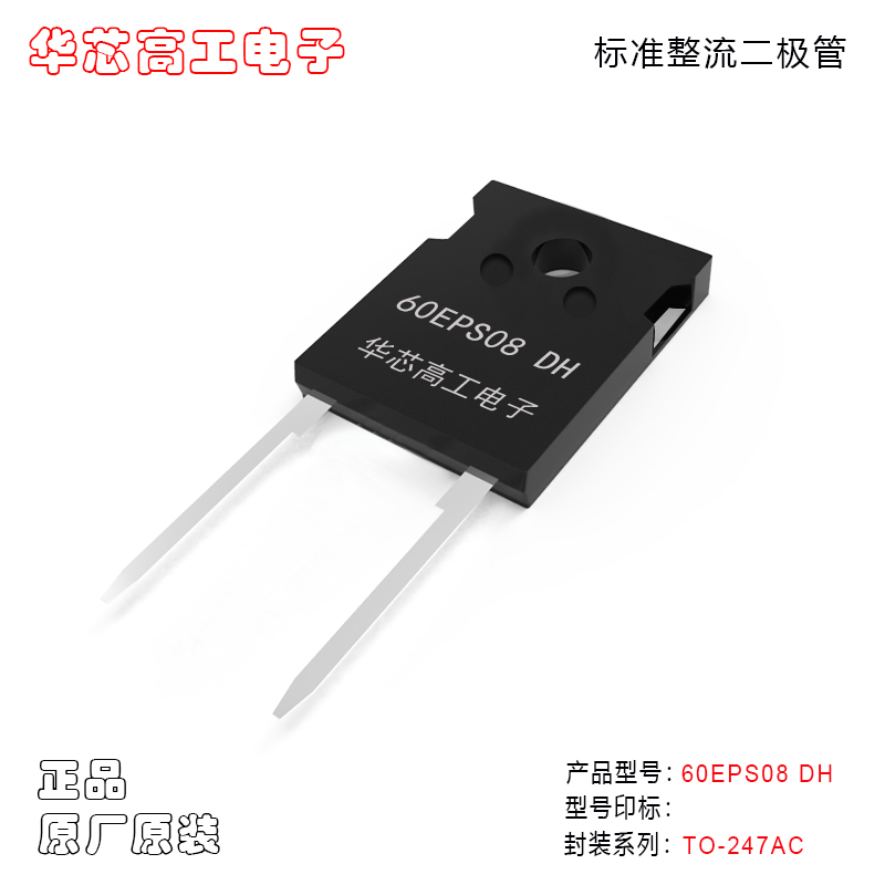 sheier/乐山希尔 全新原厂原装普通整流二极管:60EPS16 DH,60EPS14 DH;正向整流电流:60A;反向峰值电压:600V~1600V;封装方式:TO-247AC。通用电源、电器、适配器、充电器、充电桩、工控、医疗设备、工业特种电源、高频电源、风光储新能源、逆变器、伺服电机马达等产品电路作整流、续流、开关、钳位、防反接、防回流等作用。GPP大芯片高电压大电流大功率插件式通用常规标准二极管60EPS16DH/60EPS14DH。
