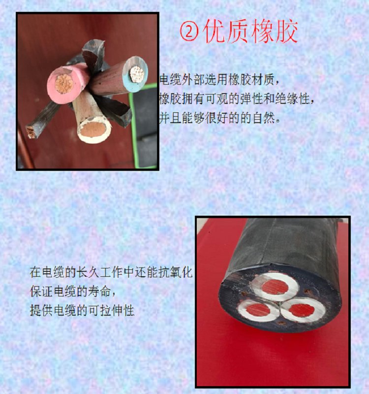 通用橡套电缆适用于可移动的电气装备、电动工具、仪器和日用电器作电源作用;适用费微光,是橡套软电缆中产量、应用面的一类产品。它采用细直径铜单线多股束合、复绞成导线后挤包橡皮绝缘层,多股绞合成揽,再挤包橡皮护套、。