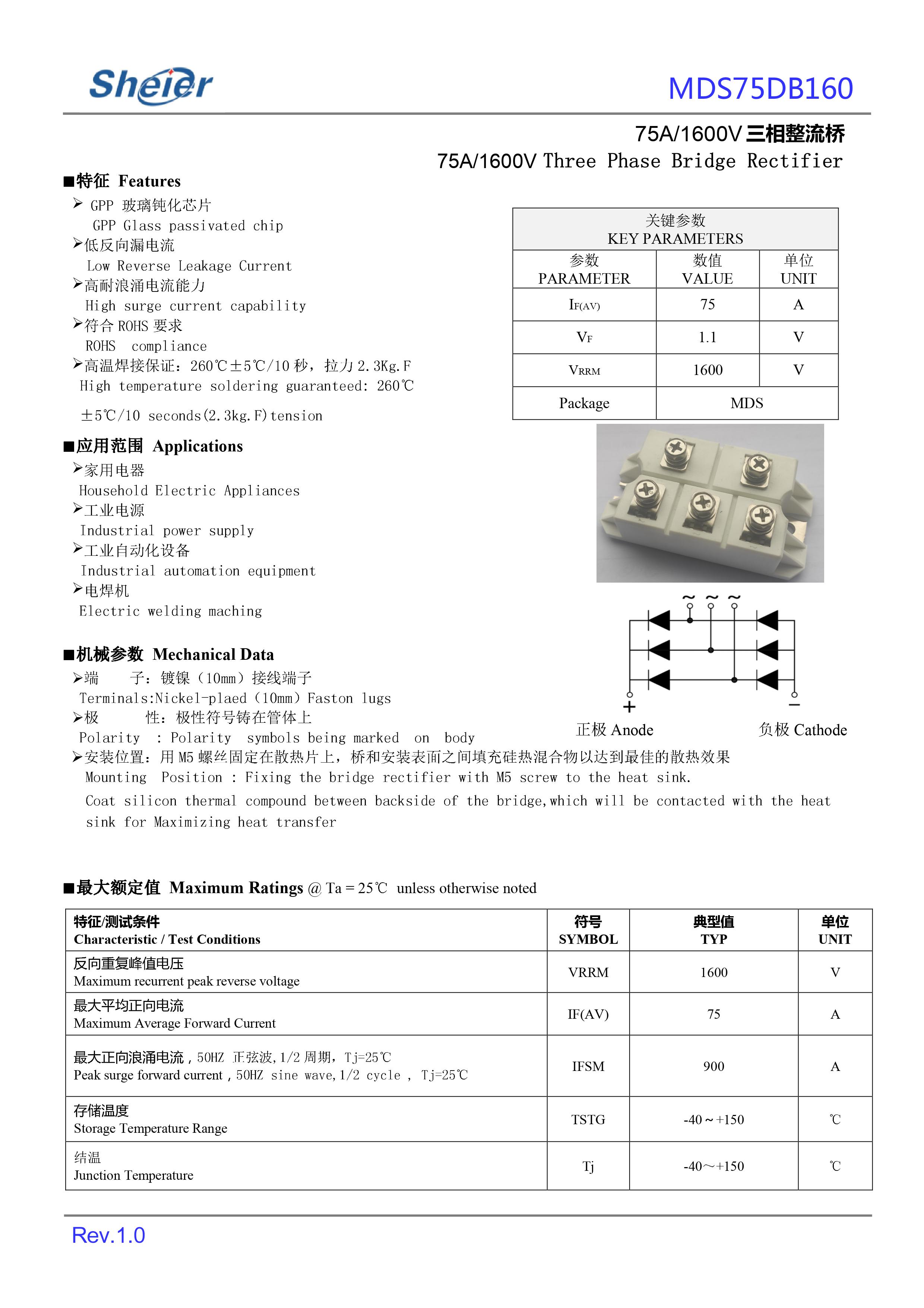 ? ? 通用于电源、电器、逆变器、电磁炉、电焊机、充电器、充电桩、工控装备、医疗设备、工业特种电源、高频电源、风光储新能源、伺服电机马达等产品电路作整流、开关等作用。大芯片高电压大电流分立式共阴极快恢复功率整流管MDS75DB120;MDS75DB160;MDS75DB180;MDS75DB200。
