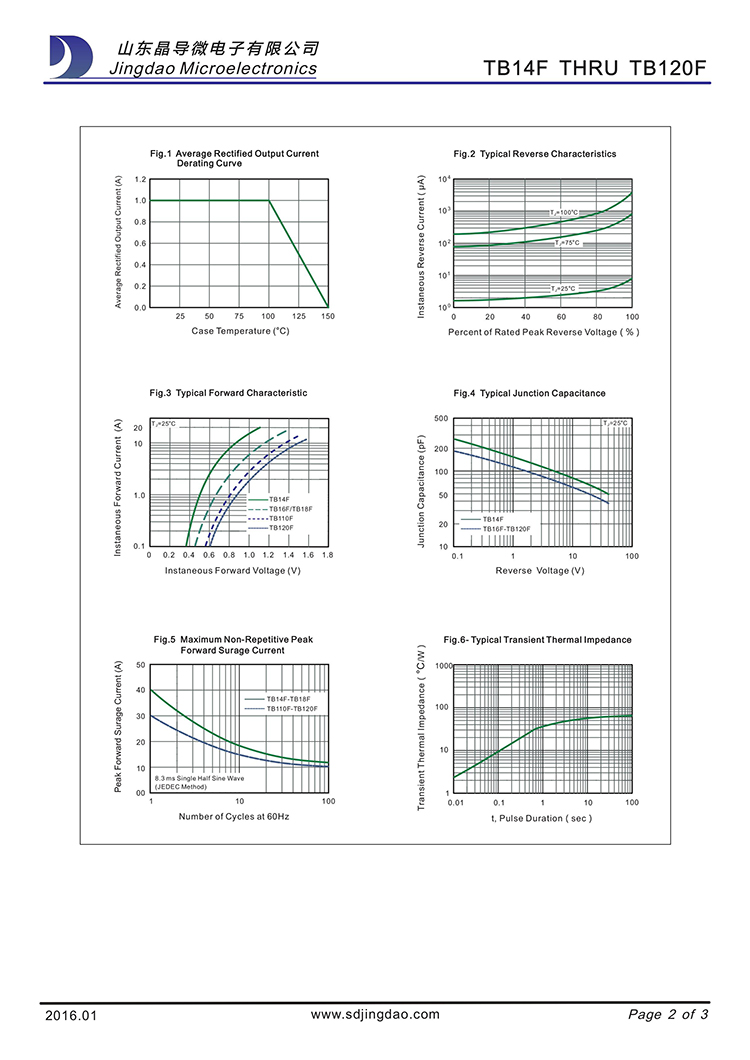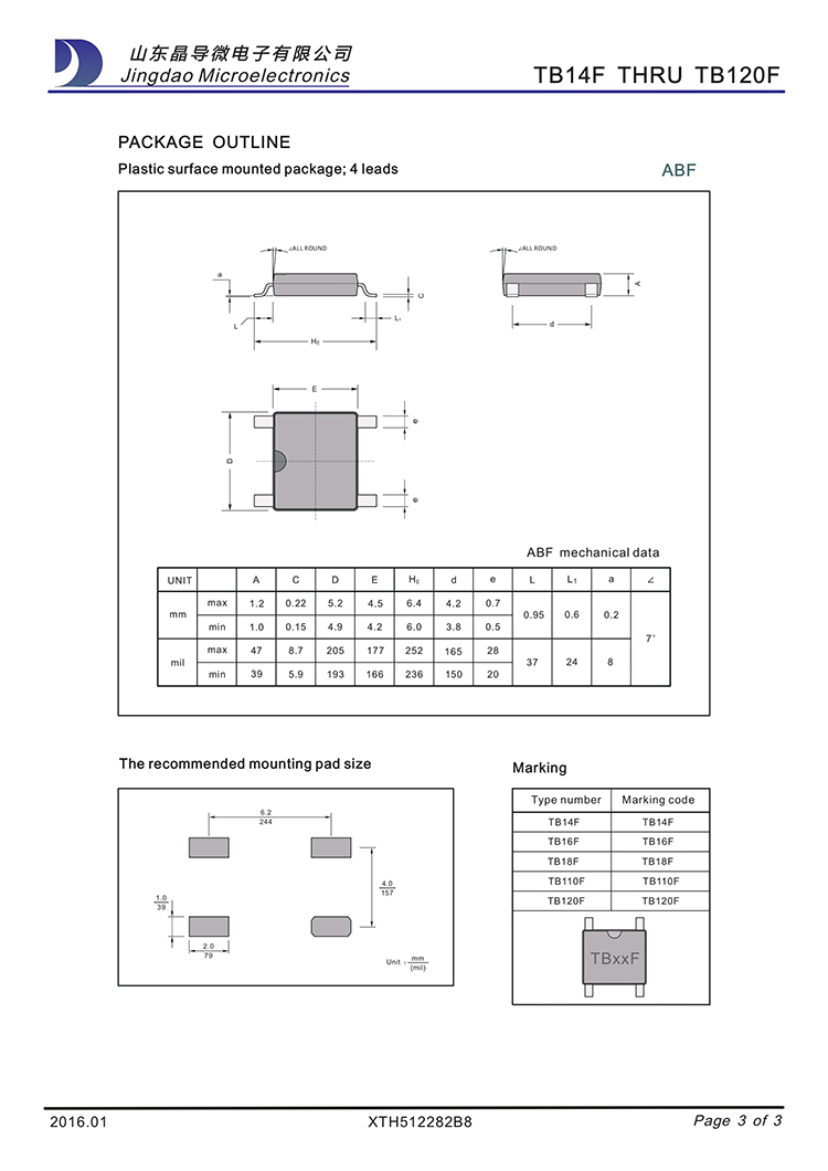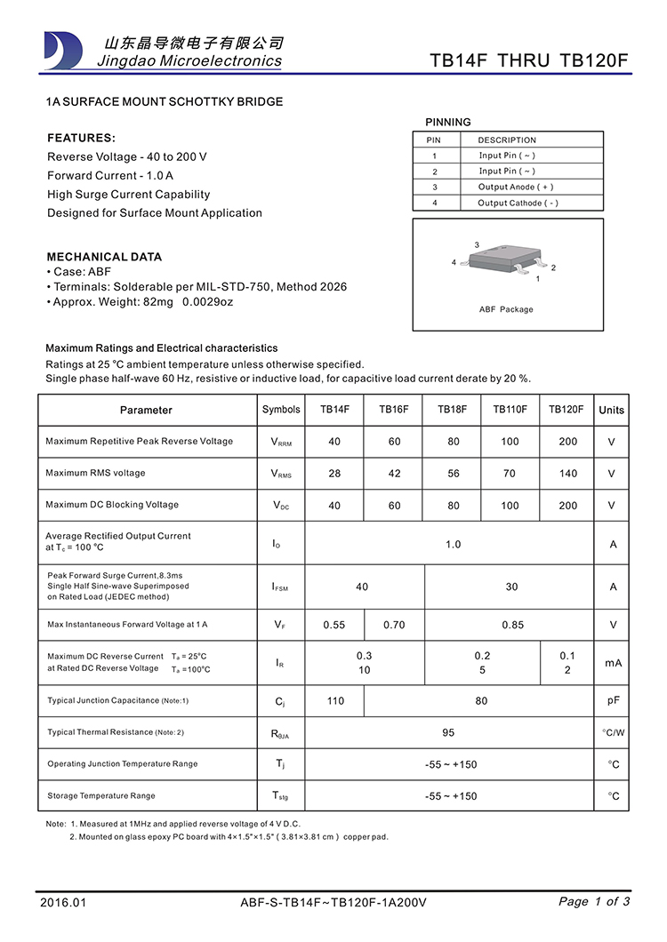 JINGDAO/晶导微 原厂原装全新正品贴片中低压超高频肖特基整流桥堆:TB120F、TB115F、TB110F、TB18F、TB16F、TB14F;反向恢复时间:5ns;最大正向平均整流电流IF:1A;最大正向峰值抗浪涌电流IFSM:30A~40A;最大反向峰值电压VRRM:200V~40V;正向管压降VF:0.55V~0.95V;反向漏电流IR:300ua;工作储存芯片结温:-55℃~150℃;安装封装方式:TBF-4 : 5.2*6.4*1.2mm。