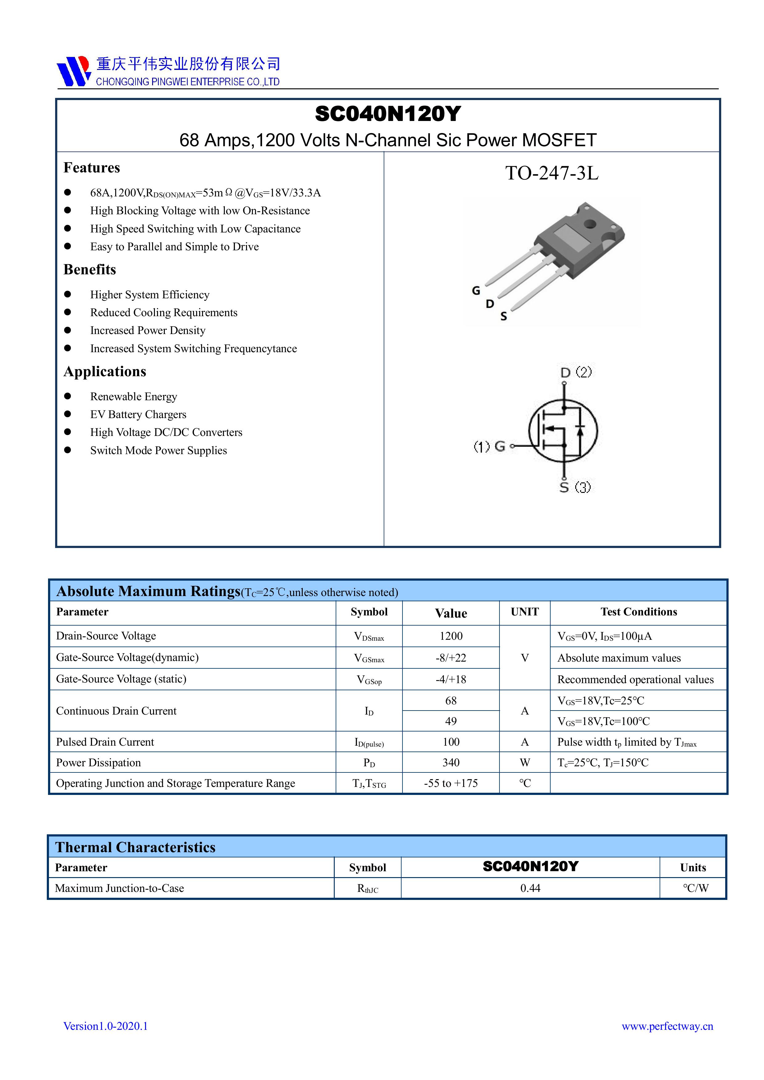 "页面标价非成交价,请联系详询报价” PY/平伟实业股份 全新原厂原装高频高压功率控制开关管 SIC碳化硅场效应晶体管,1200V,68A,0.04Ω,N-Channel,高压MOSFET:SC040N120Y;电压Vds:1200V;电流Id:68A;内阻Rds(on):40mΩ;封装方式:TO-247-3L;最小包装数量:600pcs/盒-管装。