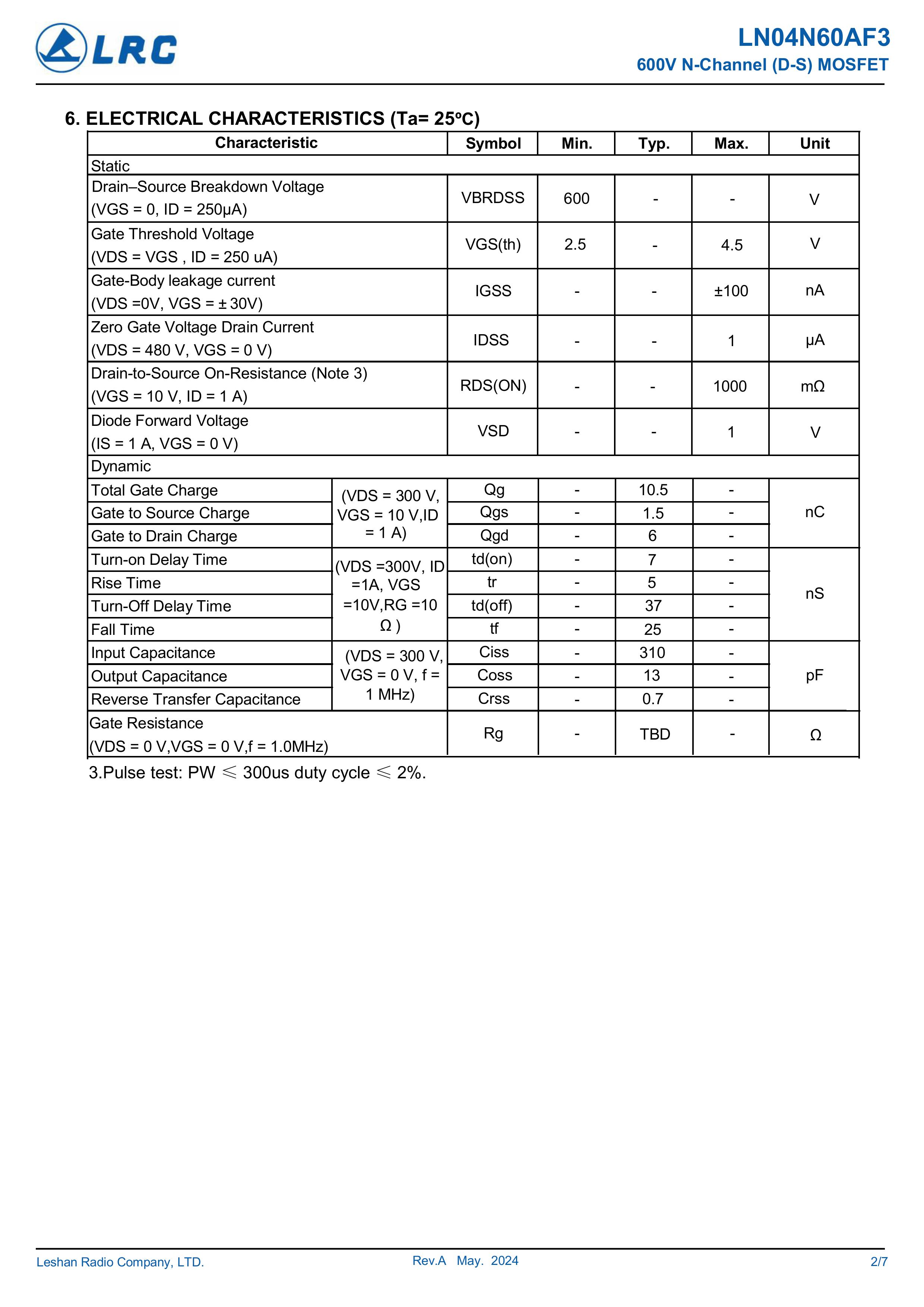 "页面标价非成交价,请联系详询报价” LRC/乐山无线电 全新原厂原装高频高压功率控制开关管场效应管,600V,3.5A,1Ω,N-Channel,高压MOSFET:LN04N60AF3/04N60AF3;电压Vds:600V;电流Id:3.5A;内阻Rds(on):1000mΩ;封装方式:TO-220F-3L;最小包装数量:1000pcs/盒-管装。