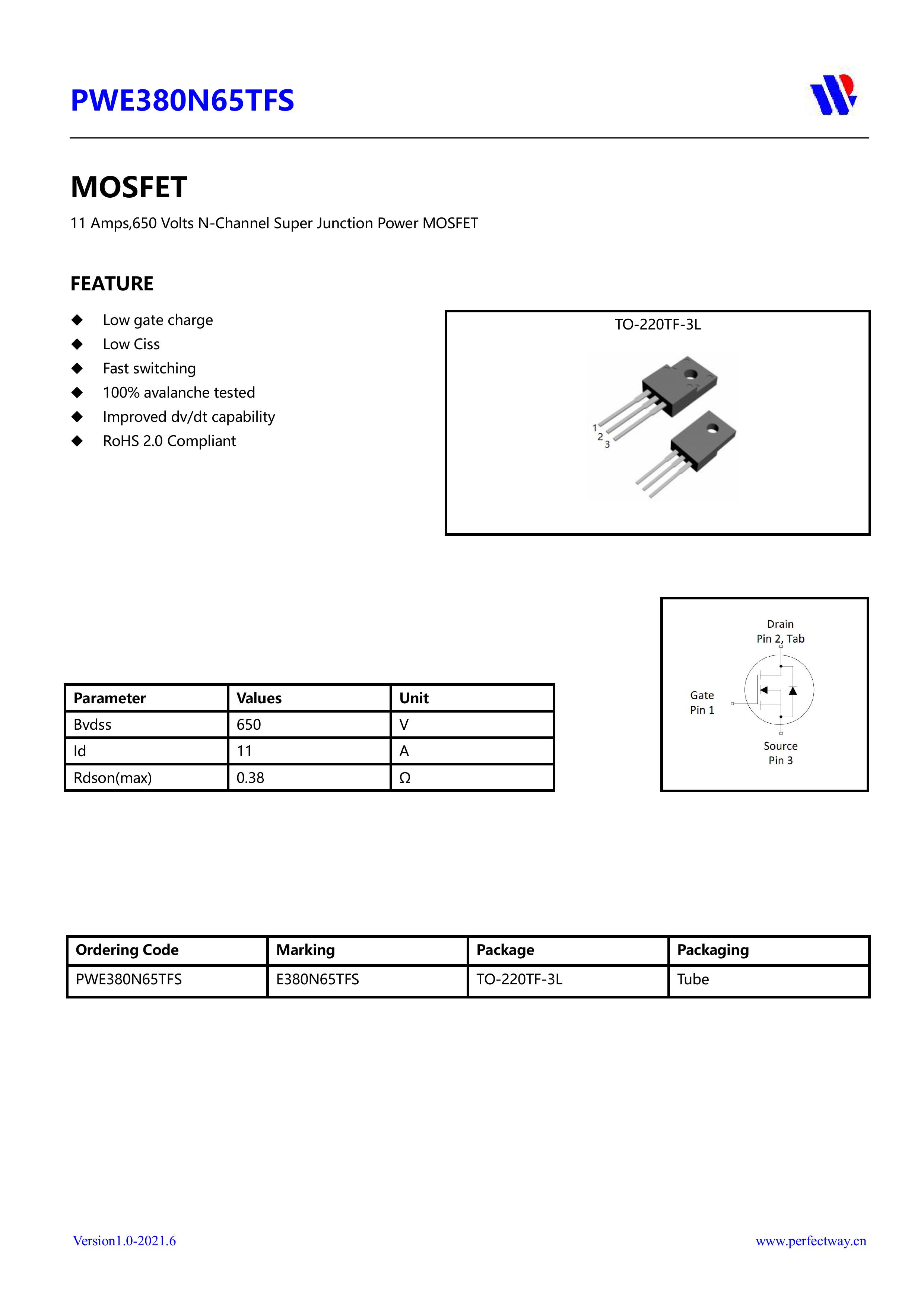 "页面标价非成交价,请联系详询报价” PY/重庆平伟实业 全新原厂原装高频高压功率控制开关管场效应管,650V,11A,0.31Ω,N-Channel,高压MOSFET:PWE380N65TFS;电压Vds:650V;电流Id:11A;内阻Rds(on):310mΩ;封装方式:TO-220F-3L;最小包装数量:1000pcs/盒-管装。