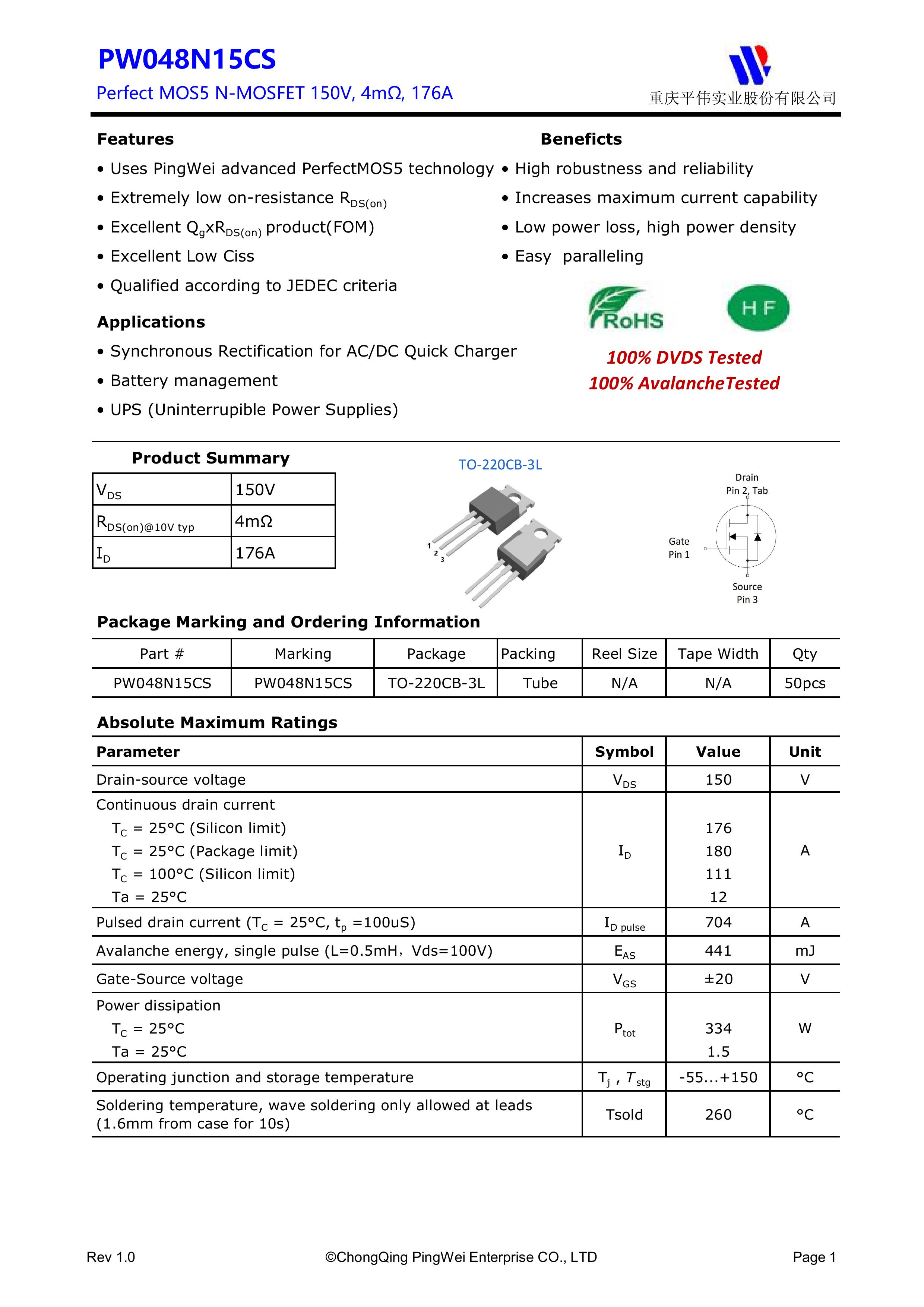 "页面标价非成交价,请联系详询报价” PY/重庆平伟实业 全新原厂原装高频中低压功率控制开关管N型沟道场效应管,150V,176A,4mΩ,N-Channel,中低压MOSFET:PW048N15CS;电压Vds:150V;电流Id:176A;内阻Rds(on):4mΩ;封装方式:TO-220-3L;最小包装数量:1000pcs/盒-管装。