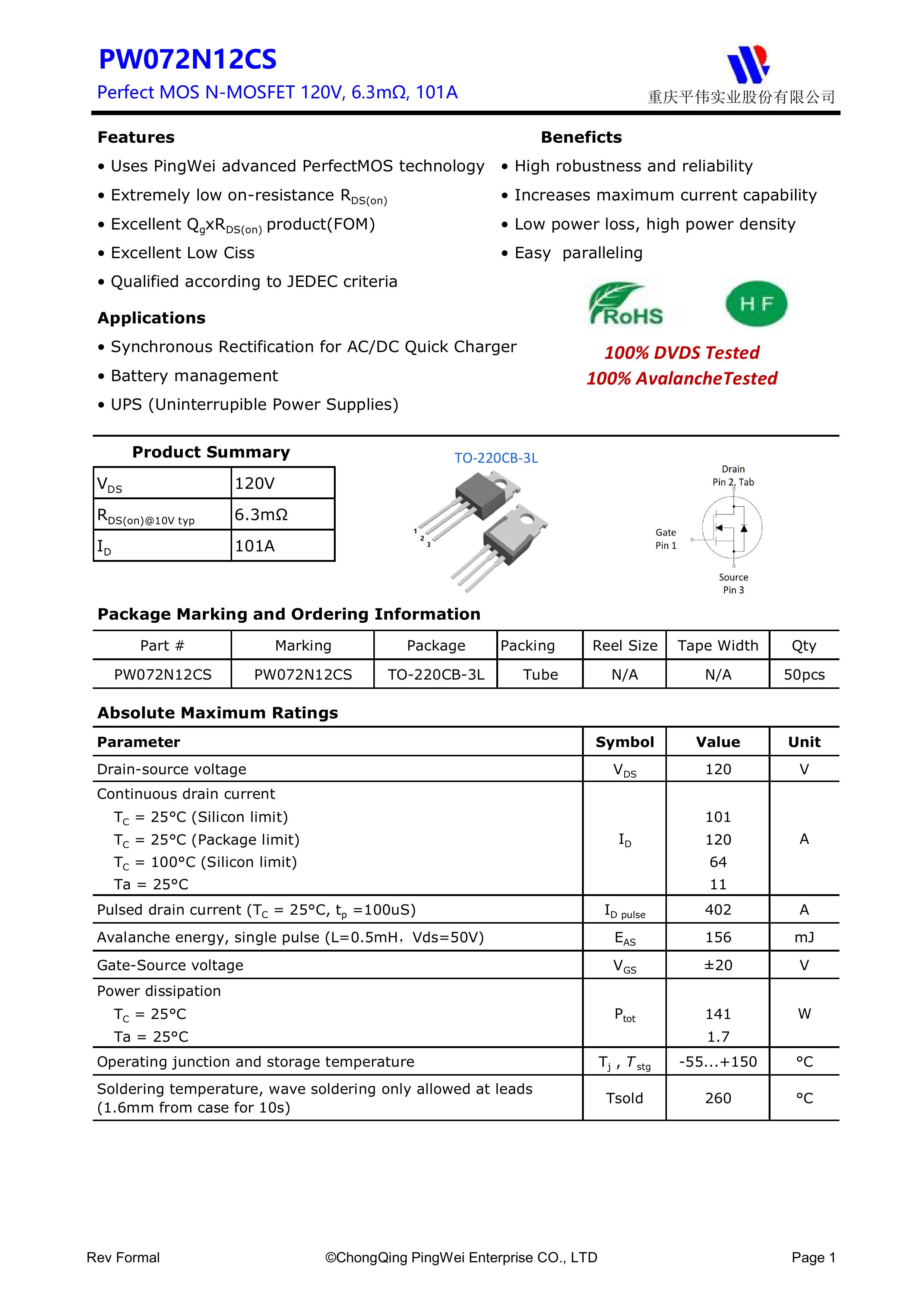 "页面标价非成交价,请联系详询报价” PY/重庆平伟实业 全新原厂原装高频中低压功率控制开关管N型沟道场效应管,120V,101A,6.3mΩ,N-Channel,中低压MOSFET:PW072N12CS;电压Vds:120V;电流Id:101A;内阻Rds(on):6.3mΩ;封装方式:TO-220-3L;最小包装数量:1000pcs/盒-管装。