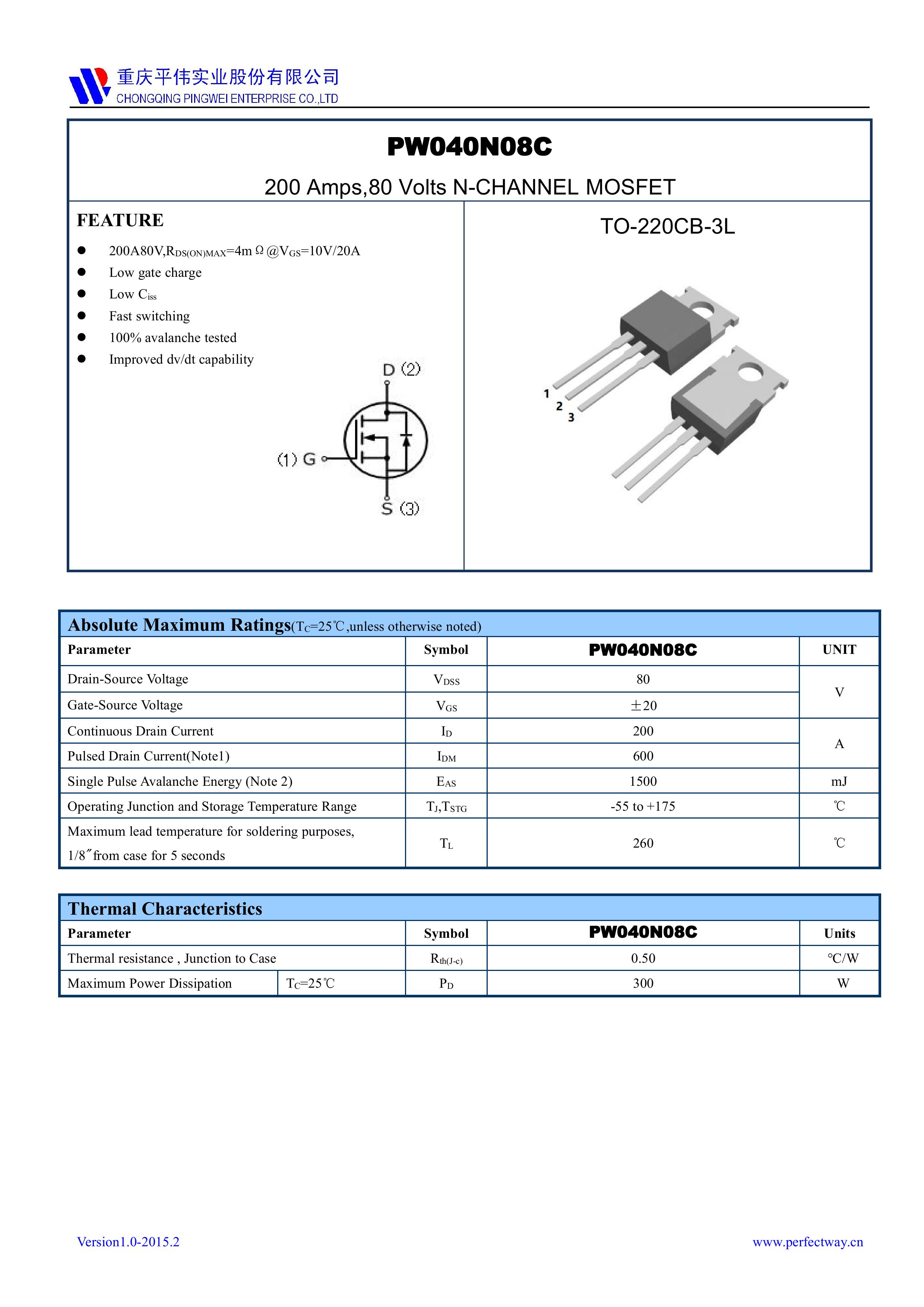 "页面标价非成交价,请联系详询报价” PY/重庆平伟实业 全新原厂原装高频中低压功率控制开关管N型沟道场效应管,80V,200A,3.3mΩ,N-Channel,中低压MOSFET:PW040N08C;电压Vds:80V;电流Id:200A;内阻Rds(on):3.3mΩ;封装方式:TO-220-3L;最小包装数量:1000pcs/盒-管装。