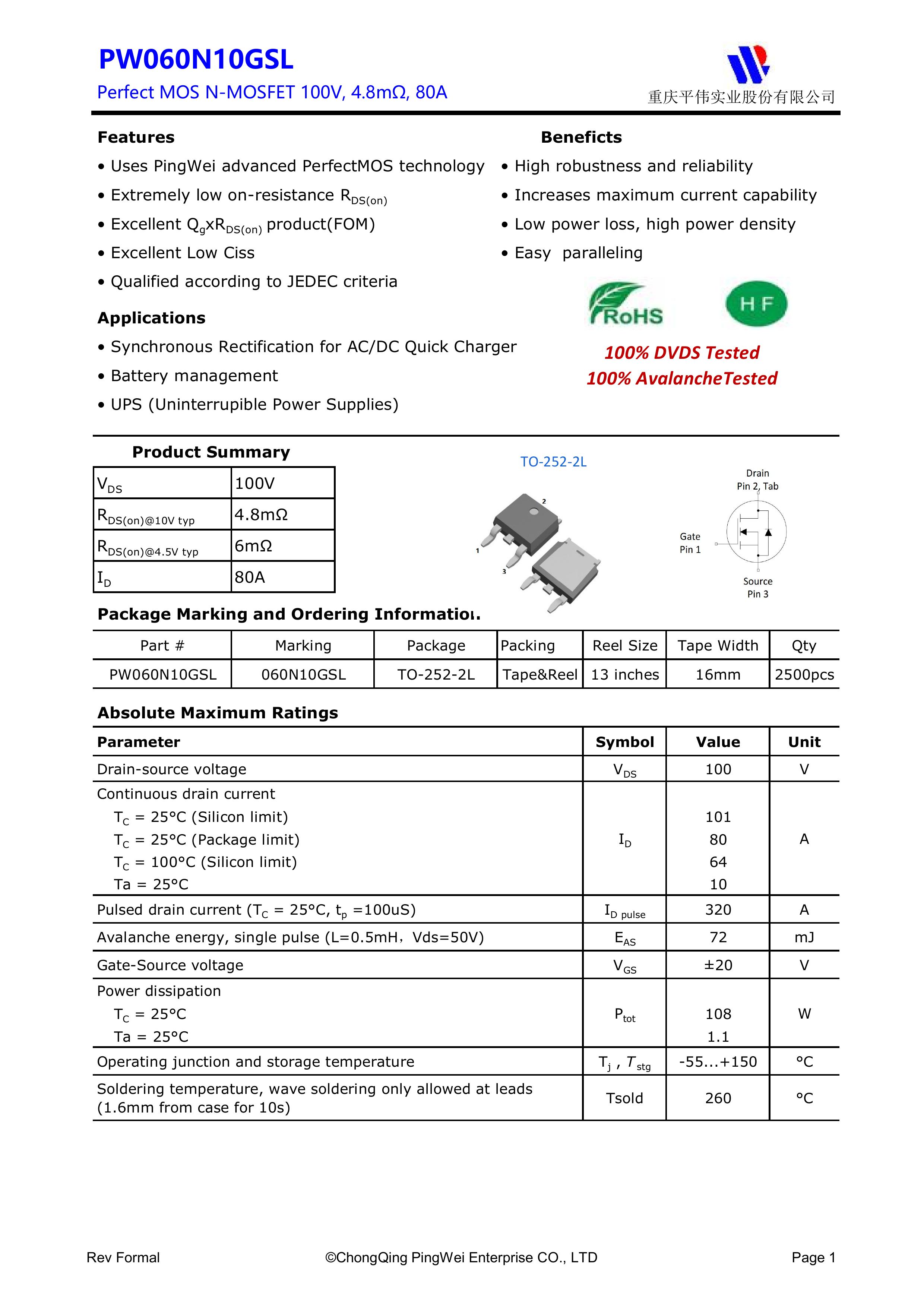 "页面标价非成交价,请联系详询报价” PY/重庆平伟实业 全新原厂原装中低压高频功率控制电子开关管 N型沟道场效应管100V、80A、4.8mΩ、N-Channel、贴片式中低压MOSFET:PW060N10GSL;电压Vds:100V;电流Id:80A;内阻Rds(on):4.8mΩ;封装方式:TO-252-2L;最小包装数量:2500pcs/盘-编带。