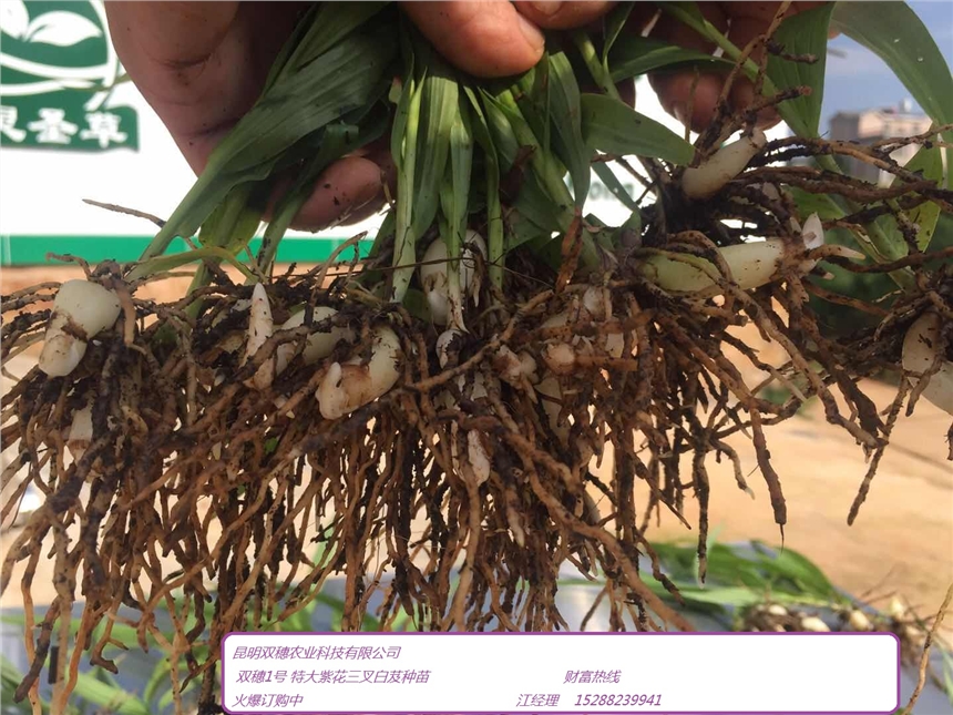 昆明双穗农业科技有限公司,公司专业培育兰科植物及种植,野生白芨,灵芝,重楼金银花的采集及研究,在中国白芨协会相关专家、教授指导下,公司自2010年开始进行对野生白芨的品种筛选,采用现代生物工程技术,在白芨的细胞培养、母苗块茎培养所用的特种组培配方,培直播苗的驯化方法,仿野生栽培方法,栽培基质,人工大面积栽培方法及种植装置等领域取得重大科研成果,摸索出了一整套科学方法。特别是公司研发的“双穗1号 ”特大紫花三叉白芨,从白芨幼苗初期营养、培育、及生根苗分化、种苗栽培等方面取得了革命性的突破, 并且“双穗1号”特大白芨种植种苗具有成活率高、产量高、抗病性强、药用价值大,经济效益显著等优势。