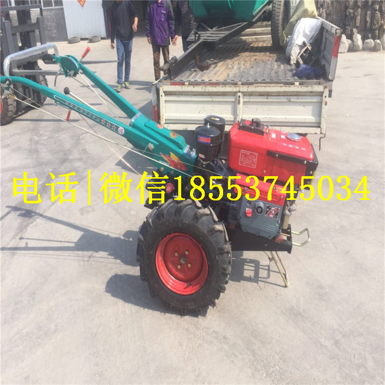 手扶拖拉机按动力大小分为2.2千瓦以下、2.2~4.5千瓦、5~13千瓦3个等级。按作业性能分驱动型、牵引型和驱动牵引兼用型。驱动型主要配套旋耕机作业,故又称动力耕耘机;牵引型主要配套牵引式农具作业;兼用型既可配套旋耕机作业(见图),又可配套牵引农具作业或配上挂车进行运输作业。按行走装置分为轮式、履带式和耕耘式。轮式手扶拖拉机按行走轮数量又分为单轮和双轮两种。