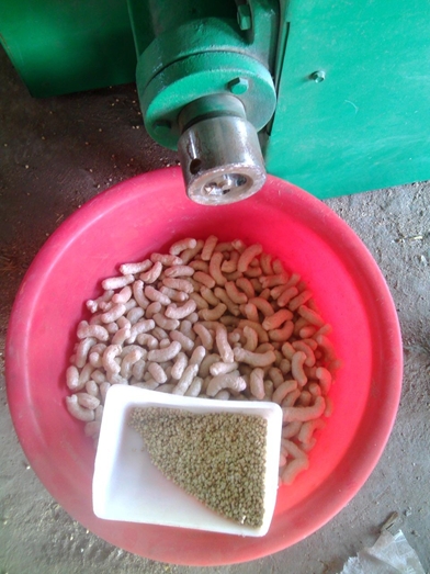 由储蓄桶搅龙抽入彭化机口,具有耐磨和寿命长的优点,把料抽放储蓄桶。将麦皮,不会造成饲料的浪费,出料螺母拆不开,把前段切料部份拆开,直接加入机械内即可膨化生产不同颗粒形状新颖、口感独特、营养丰富、组织细腻,不会污染水质,不膨化。