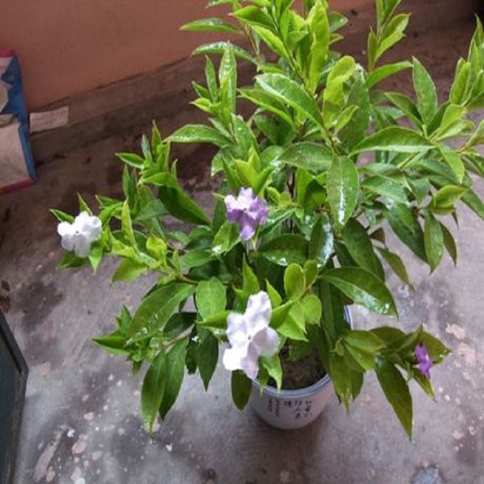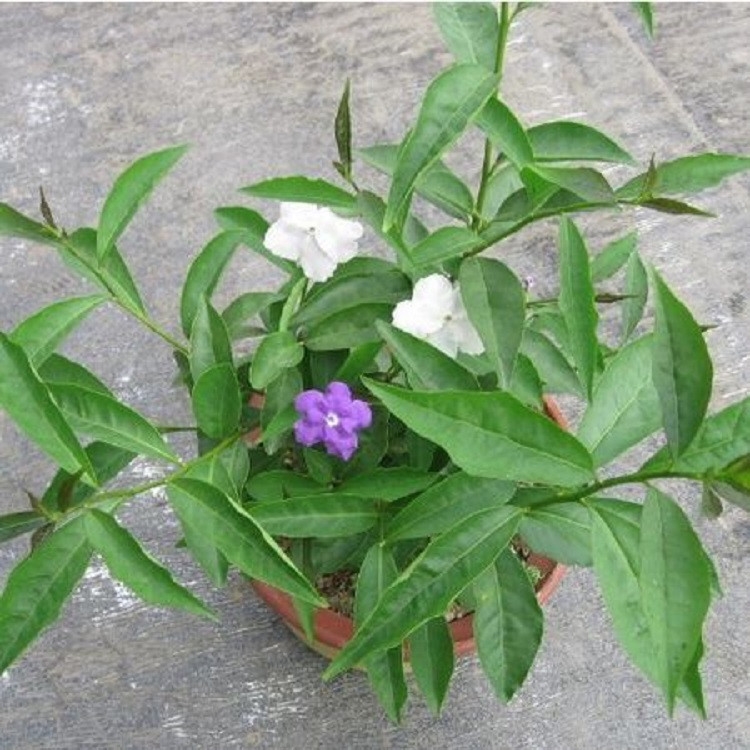 鸳鸯茉莉:茄科鸳鸯茉莉属常绿矮灌木,是华北夏季露天摆放和冬季室内布置的优良盆栽花卉。鸳鸯茉莉高50至100厘米,单叶互生,花大多单生,少有数朵聚生的。花冠呈高脚碟状,有浅裂,花期4月至10月,单花开放5天左右。花朵初开为蓝紫色,渐变为雪青色,后变为白色,由于花开有先后,在同株上能同时见到蓝紫色和白色的花,故又叫双色茉莉。
