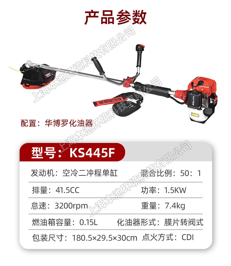 型号:KS445F 排量:41.5cc 功率:1.5kw 化油器形式:膜片转阀式 怠速:3200rpm 重量:7.4kg 燃油箱容量:0.15L 包装尺寸:180.5x29.5x30厘米 发动机:空冷二冲程单缸 混合比例:50:1