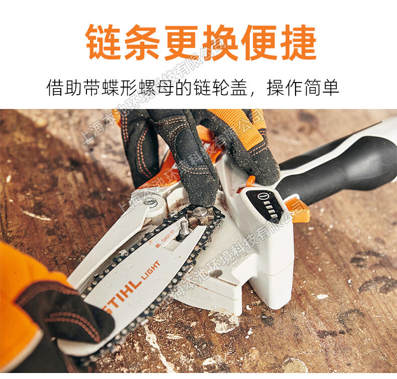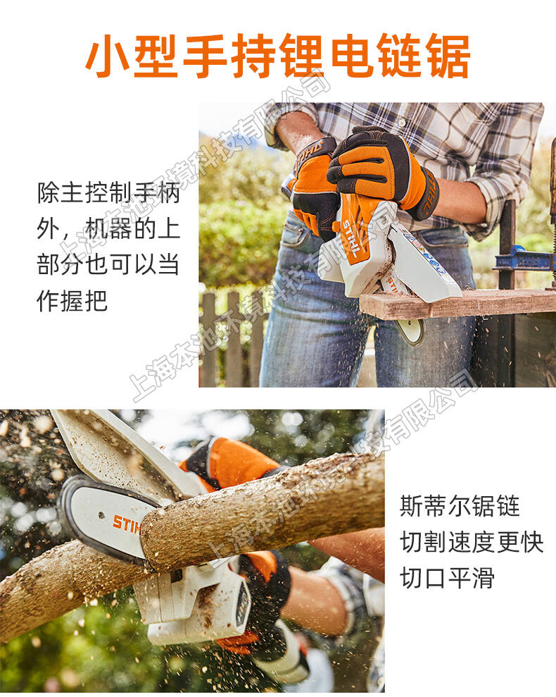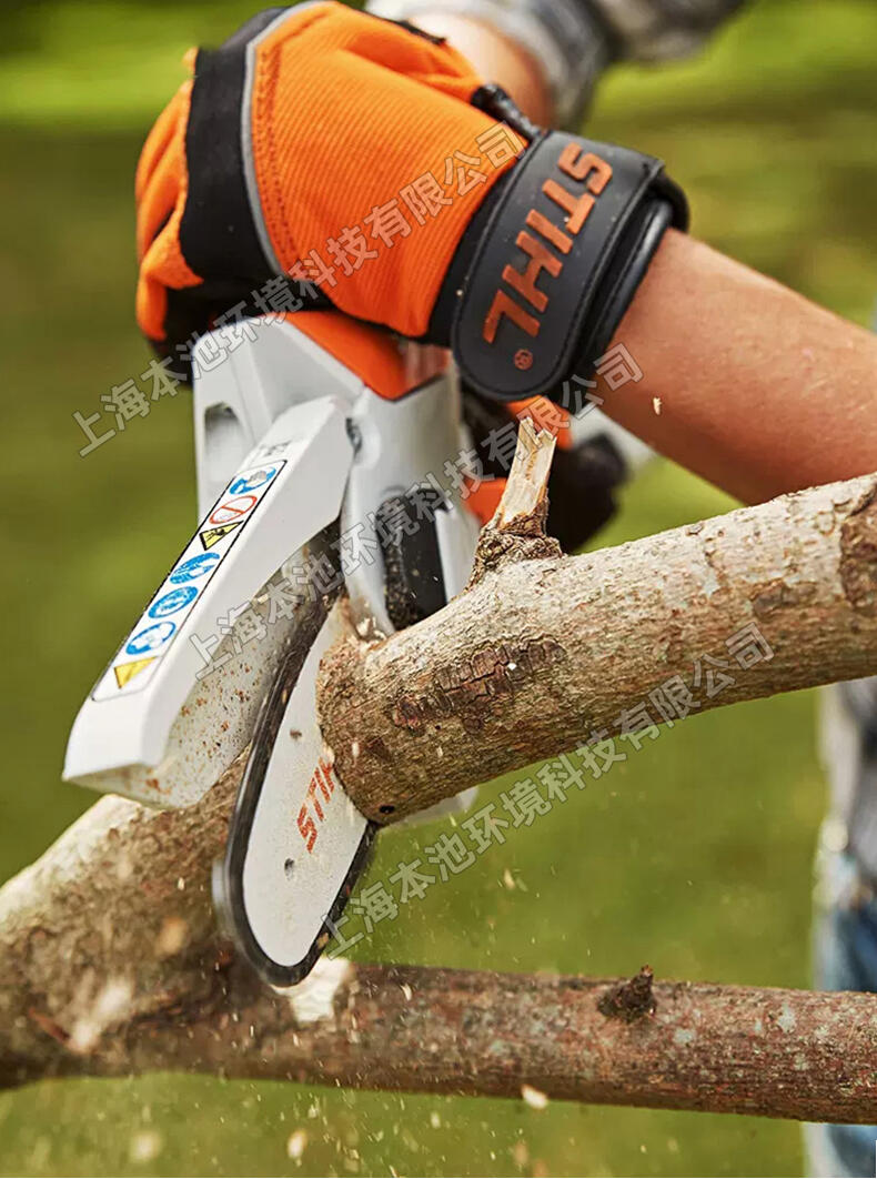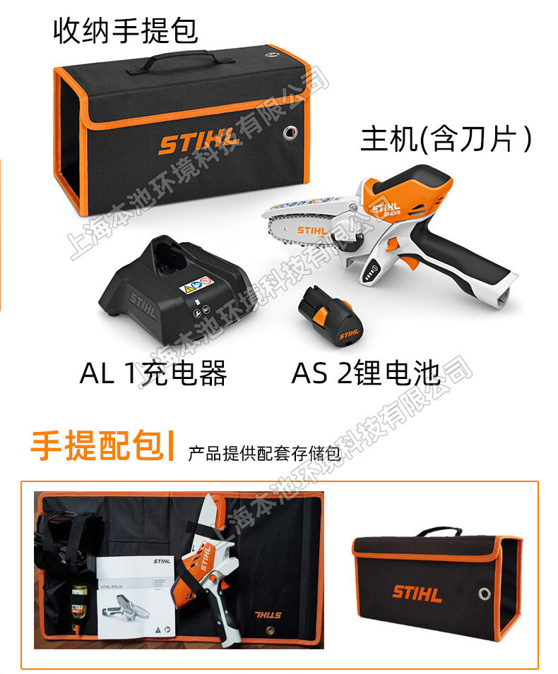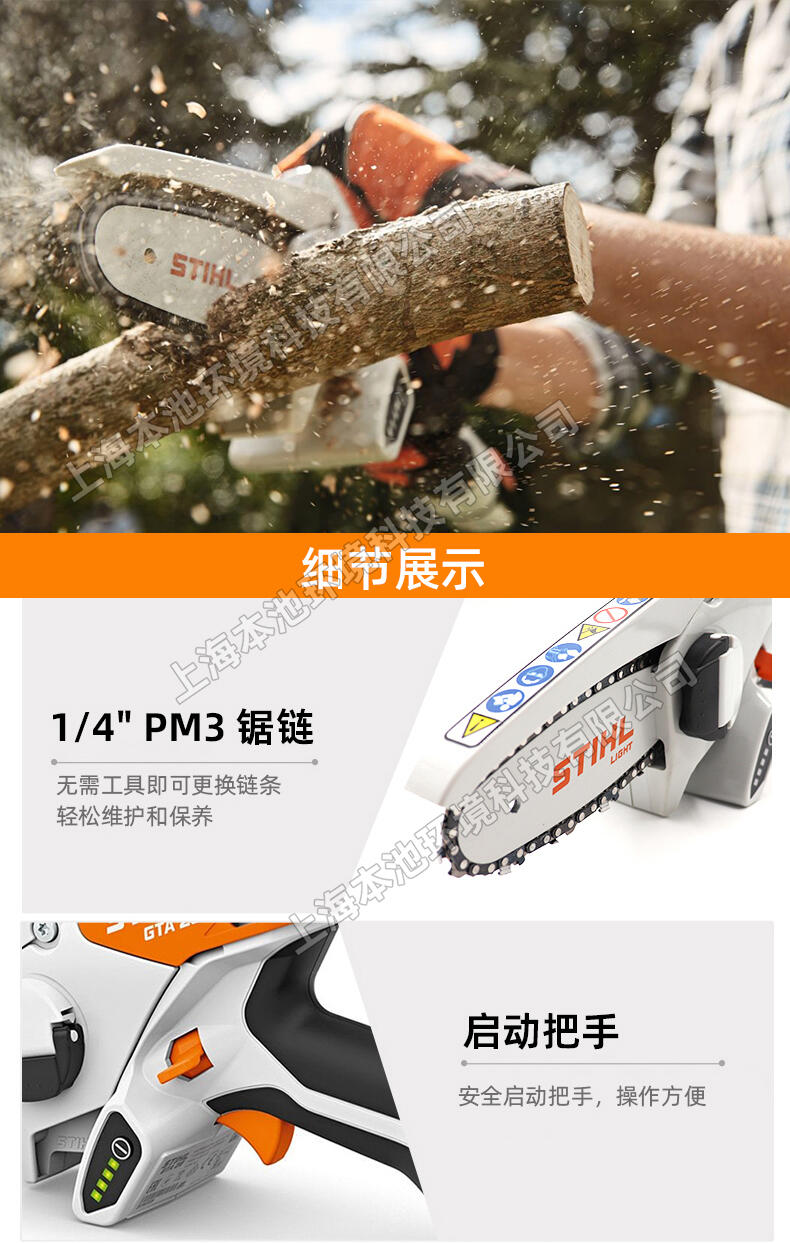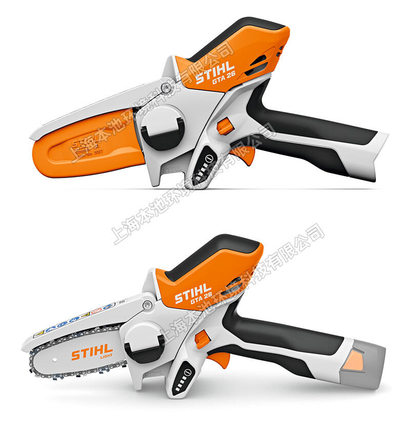 STIHL斯蒂尔GTA26手持式锂电锯,多功能无绳树木修剪机,10.8V锂电修枝锯。1.45KG轻量化设计,简单易操作。PM31/4"P链条设计,切割平整。链速8m/s,切割速度快。迷你锂电锯。链条更换便捷。适合多种场合,树木修枝,木材修剪,园林绿化修剪等。