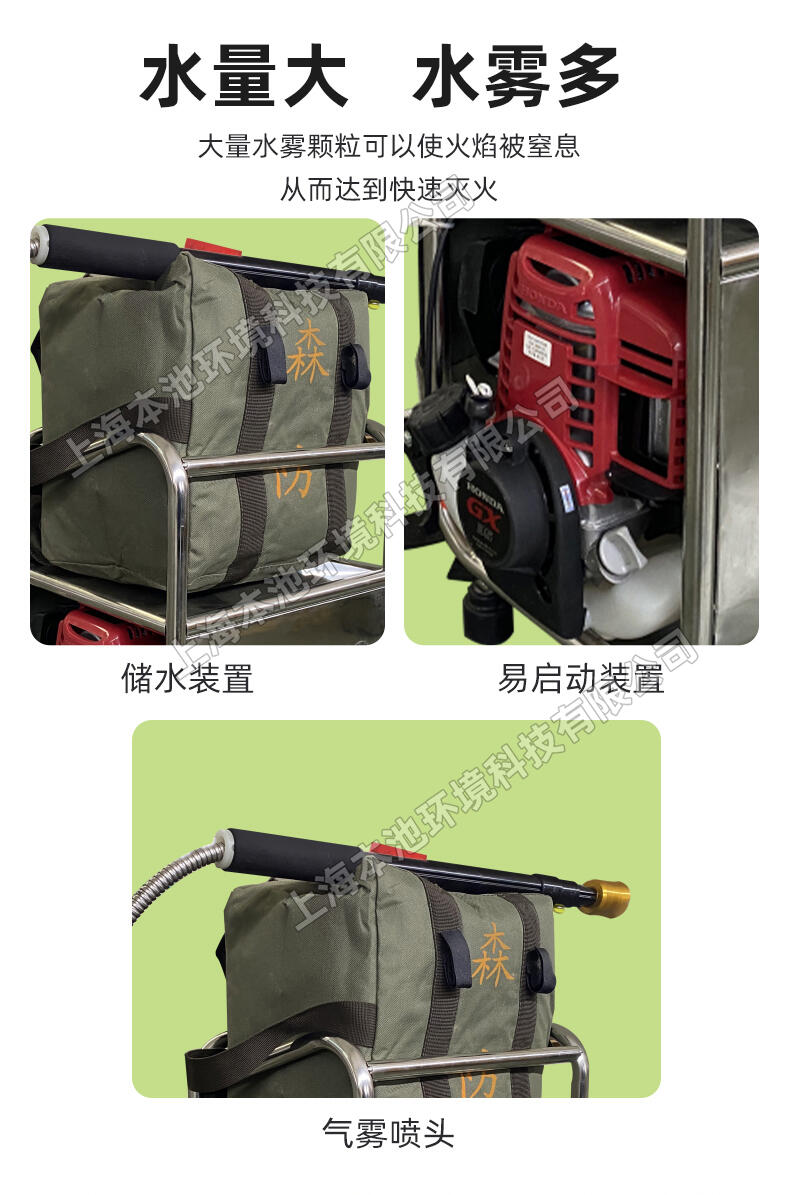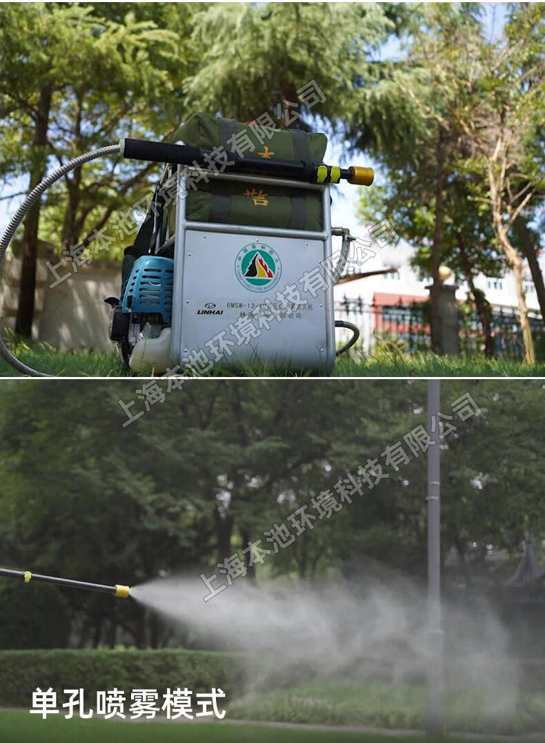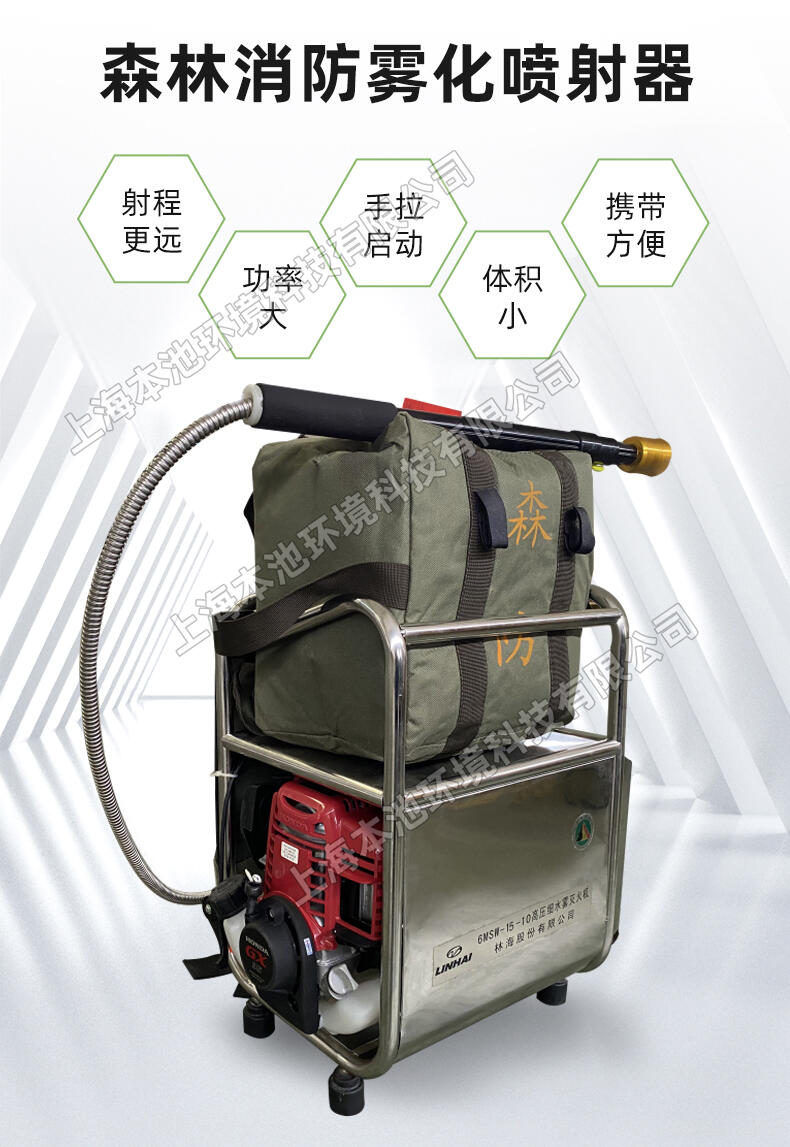 LINHAI林海6MSW-15-10森林消防灭火高压细水雾灭火机,背负式高压细水雾灭火机通过四冲程发动机驱动高压柱塞泵,从水枪的雾化喷嘴以多种型式喷射出雾滴,形成高压细水雾,能实现快速灭火。主要应用于初起火灾、火场余火清理和草地火灾扑救等。