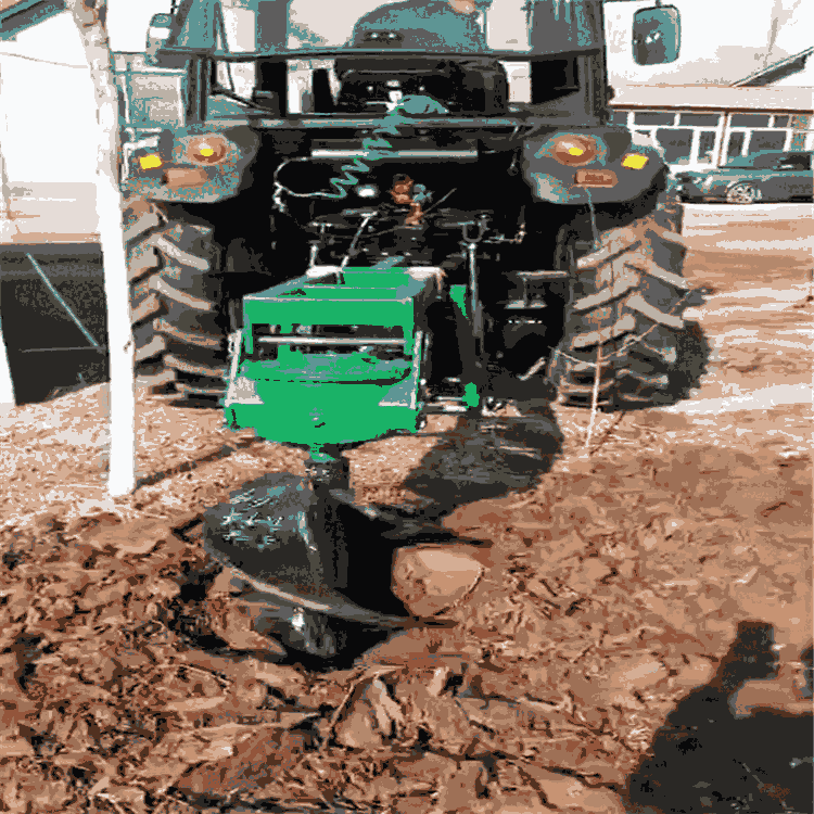 悬挂式挖坑机由传动轴、减速器、钻头、拉杆和机架等组成。通过液压悬挂装置挂在拖拉机后面,由拖拉机动力输出轴经传动系统驱动钻头进行挖坑作业,钻头一般采用双螺旋型,有的挖坑机装有两个或两个以上的钻头,称多钻头挖坑机,能充分利用拖拉机功率和提高生产率。为使钻头在工作时不因遇到石块、树根等障碍物超负荷时受损,在传动轴上装有牙嵌式离合器,在超负荷状态下,离合器自动打滑,从而切断动力的传递。拖拉机挖坑机又叫悬挂式挖坑,大型挖坑机的一种别名。