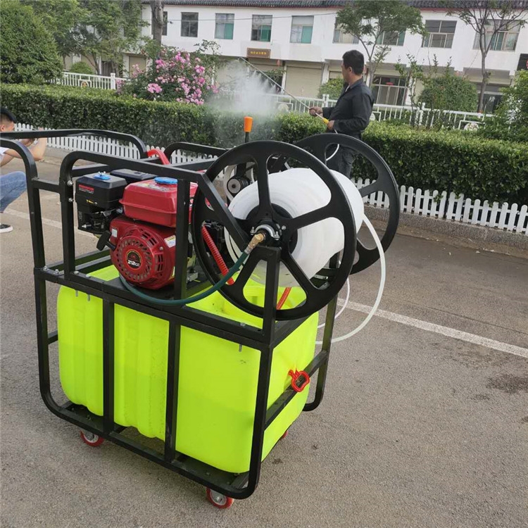 高压打药机又名高压自动喷雾器,汽油喷雾机的优点:效率高(可达普通手摇喷雾器的3到4倍)、劳动强度低、可连续作业。易损件少维修率,基本无使用成本。产品主要适用于农业、水稻、果园、花圃苗木、蔬菜基地等喷药防除治病虫害及抽水灌溉等作业,也可用于清洗车辆公共场所,垃圾场地以及畜牧业等喷药杀菌消毒。动力、药泵、可任意组合,满足不同层次及市场需要。特有回液搅拌装置,喷药、消毒前后效果一样。滚珠卷管器,特别轻便,省力。