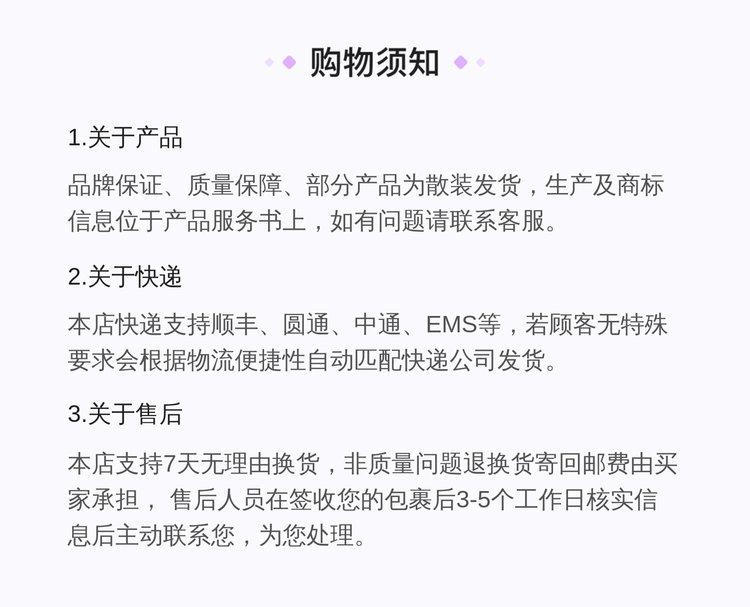 快递支持 | 顺丰、圆通、中通、EMS等 | ||
