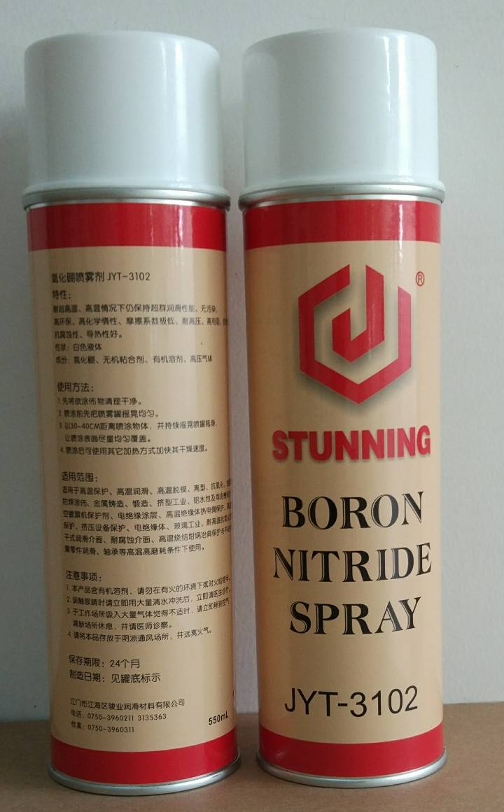 喷涂STUNNING JYT-3102氮化硼喷雾剂,常温状态下可防止工作带表面生锈,长时间预热期间可保护工作带表面不发生脱碳和氧化,维持工作带表面的原始硬度,不产生软点和软带,挤压时可增加与模具间的润滑,减小与模具间的摩擦,避免模具阻滞和压塌,使产品生产更为畅顺,减小波纹的产生,提高产品的表面光滑度,防止粘结,避免粘模,粘铝,减小修理模具次数,减小模具氮化次数。应急使用时,甚至替代氮化或不氮化就可以使用模具,延长模具使用时间,大大节省成本。并能替代传统污染产品,质量更优良,并无烟,无油,无污染,高环保,可营造舒适,干净生产车间,工人操作方便简易,品质长久耐用,并能累积反复使用,深受操作工人喜爱,从而也解决工厂因为过去的污染氛围环境招工难问题,也节约成本,同时响应了国家高环保政策,低碳生活要求。