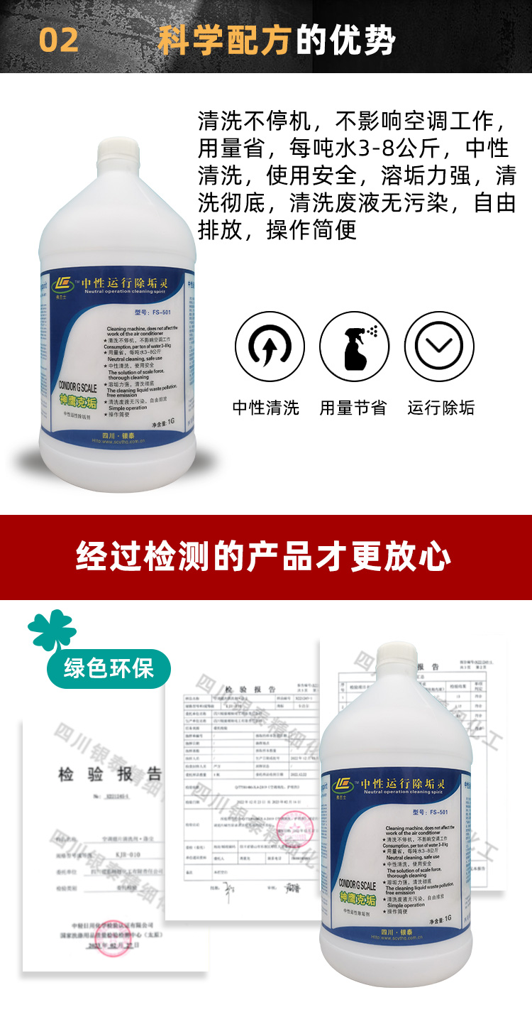弗兰士系列产品受助于美国陶氏化学技术支持,及原材料供给,优化了产品质量。神鹰克垢(运行除垢灵.不停机除垢灵)的诞生是中央空调循环水系统清洗的一次革命。FS-501因操作简单,用量省,PH值中性,腐蚀率极小,难溶垢清洗能力强,废液自由排放等诸多优点而受人们的欢迎。