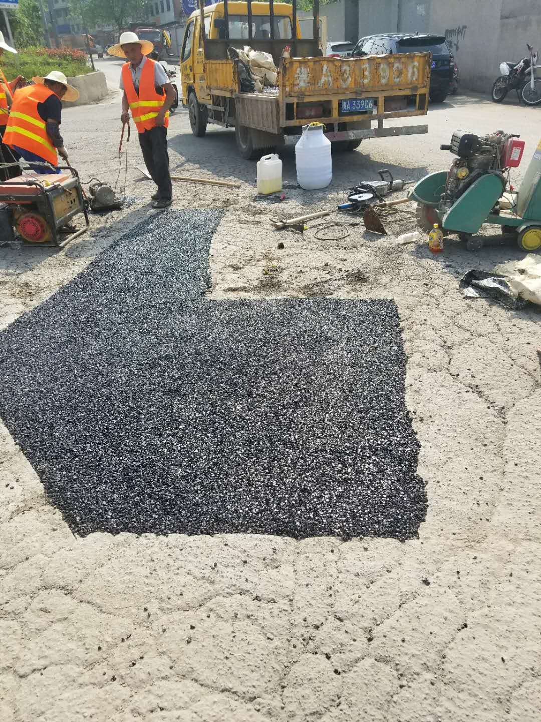 无需配备专门的工具与设备,也无需专门的技术,备料可随用随取,可直接倒入坑槽(需修补区域),用汽车车轮碾压几遍或用冲击夯压实即可开放通车。