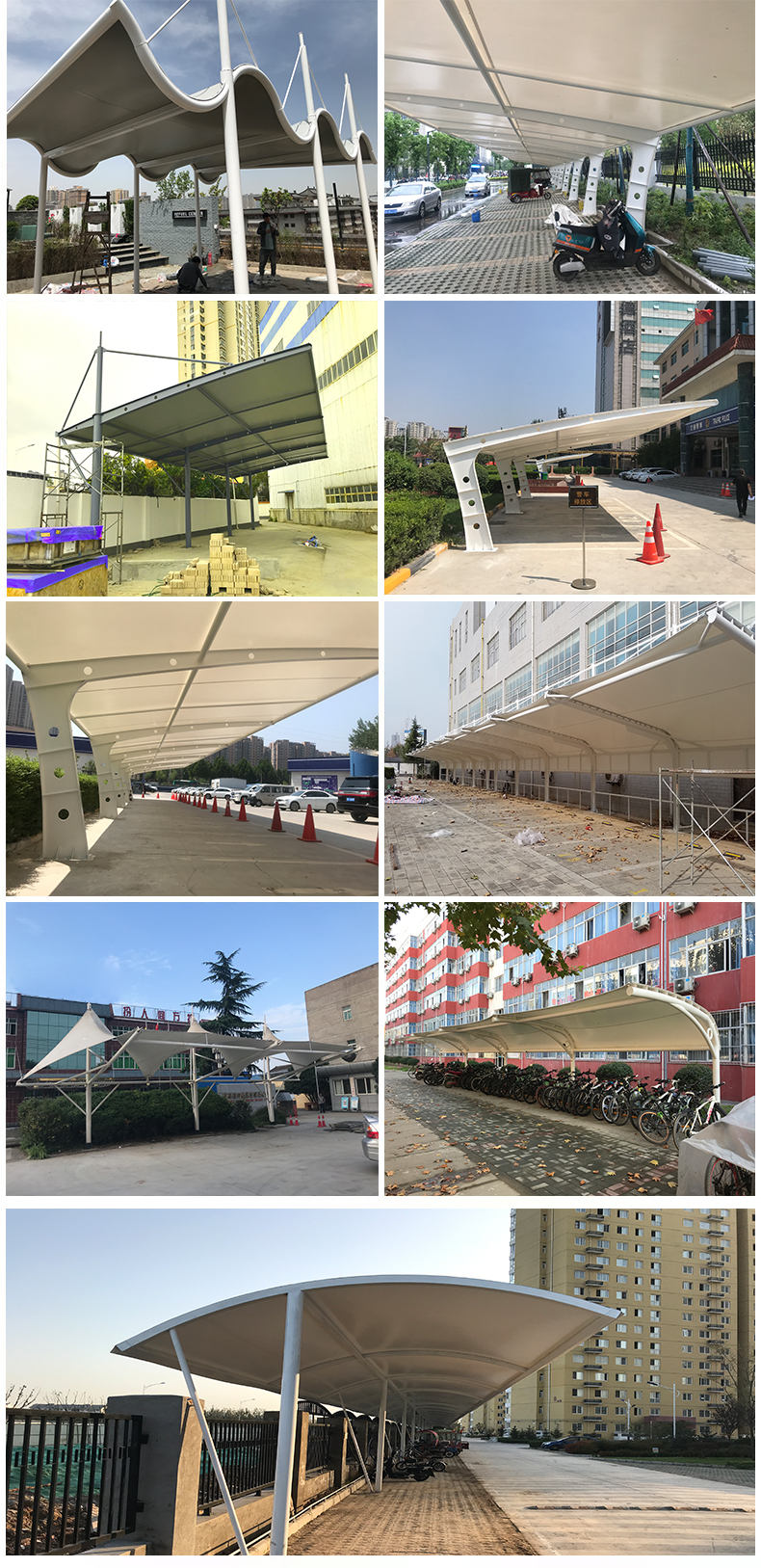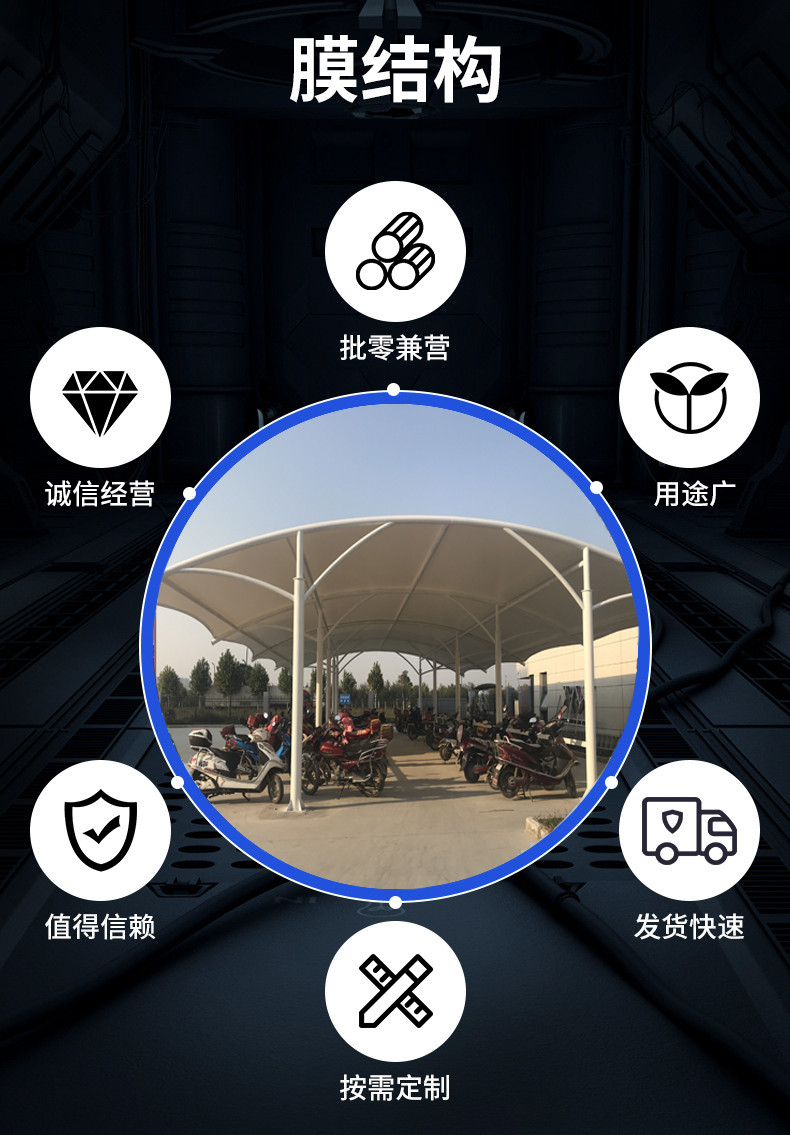 膜结构车棚是由钢结构和膜材组成,分别有张拉式膜结构、索膜结构、骨架式膜结构、空间结构式等供选择,根据不同场景进行设计。