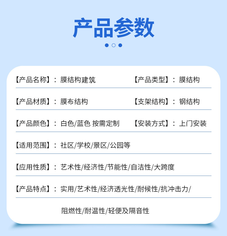 2.膜结构系列产品、张拉膜系列产品有很多种款式,所以产品无法在网上给出一个十分准确的价格,请下单前确认好再下单。