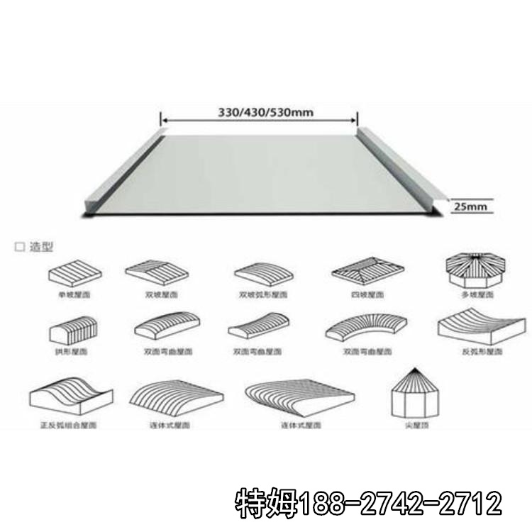 直立锁边65-430铝镁锰合金板肋高65mm,标准板宽300-500mm,板厚0.7-1.2mm,金属屋面工程中常采用0.9mm厚,采用高质量氟碳涂层。广泛应用于机场航站楼、飞机维修库、车站及大型交通枢纽、会议及展览中心、体育场馆、展示厅、大型公共娱乐设施、公共服务建筑、大型购物中心、商业设施、民用住宅等建筑。
