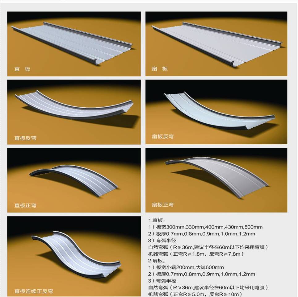 直立锁边铝镁锰屋面板具有以下优点: 1.设计先进、经济、合理,满足保温隔热、隔音降噪的功能要求;2.自然循环通风,长寿命,抗腐蚀,季候性好,终身免维护; 3.表面无螺钉外露,免除污染与老化问题,建筑物外观完整; 4.优越的防水性能和良好的空气渗透性能; 5.屋面系统与结构整体的防雷体系紧密连接,作为防雷接闪极; 6.屋面可设置采光天窗、自动开启消防排烟窗; 7.屋面板允许在温差下延伸、移动,每件板纵向长度不限; 8.可以承受较大荷载,允许安装、维护人员在屋面行走,安全坚固; 9.可弯制成内、外弧状,每块板在长度方向无限制,结构简洁、轻巧; 10.防火性能已通过欧洲的防火实验,等级为AA级; 11.移动式机械设备现场加工,安装快速、简洁。 直立锁边铝镁锰合金板肋高65mm,标准板宽430mm,板厚0.8-1.2mm,常采用0.9mm,采用高质量氟碳涂层。广泛应用于机场航站楼、飞机维修库、车站及大型交通枢纽、会议及展览中心、体育场馆、展示厅、大型公共娱乐设施、公共服务建筑、大型购物中心、商业设施、民用住宅等建筑。