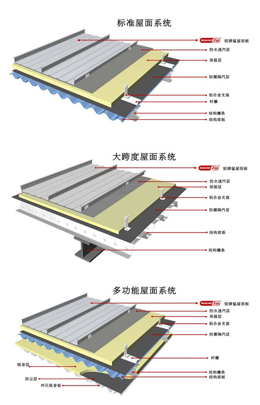 根据建筑功能的要求及地区气候环境因素的影响,镁锰板与保温棉(或挤塑板)、防水透气膜、保温棉(吸音棉)、防潮隔气膜、底层压型板等组成保温性能更加优越的耐候性金属屋面结构系统,广泛应用于温度变化较大的建筑物上。