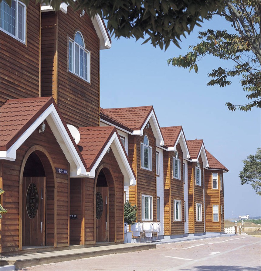 彩石金属瓦美观、轻巧、耐用、环保,有欧式和中式两种瓦型,铺装后能使建筑屋面具有流畅的曲线感、凹凸有序的层次感和天然石质的厚重感,能够完美展现西方建筑与东方建筑的不同建筑美感,提升建筑物的品味和档次,近年来已经成为国际屋面材料的主流产品,国内的一些档建筑已开始大量使用。