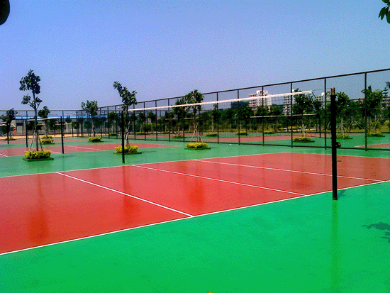 3、抗污性强面层——坚韧、密实,不易被鞋底或其它硬物刮化,可长期保持保持球场光洁如新。无人看管的球场也适合使用。